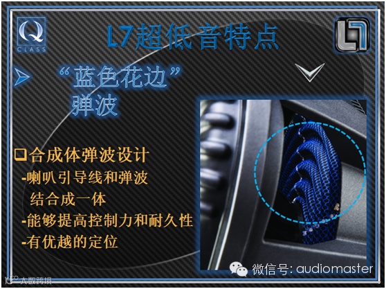 合成体弹波设计,喇叭引导线和弹波结合成一体,能够提高控制力和耐久性,有优越的定位。