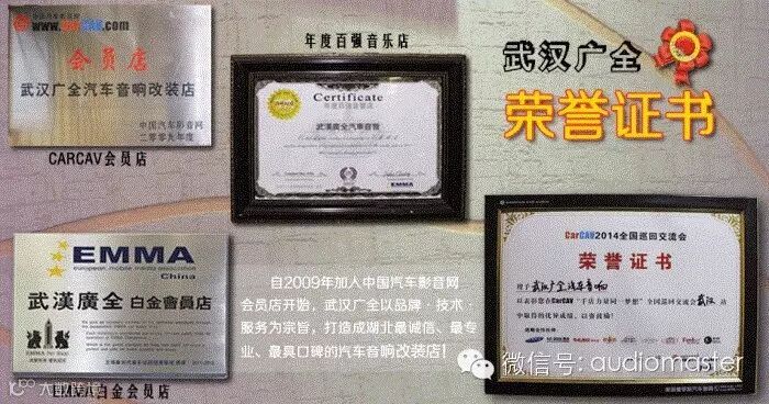 经过十多年的努力,武汉广全汽车音响已发展成为湖北省汽车影音行业颇具影响力的品牌。2011年荣获欧洲EMMA汽车多媒体竞赛联盟湖北地区白金会员店,2013年被EMMA评为全国年度百强音响店、精英奖!