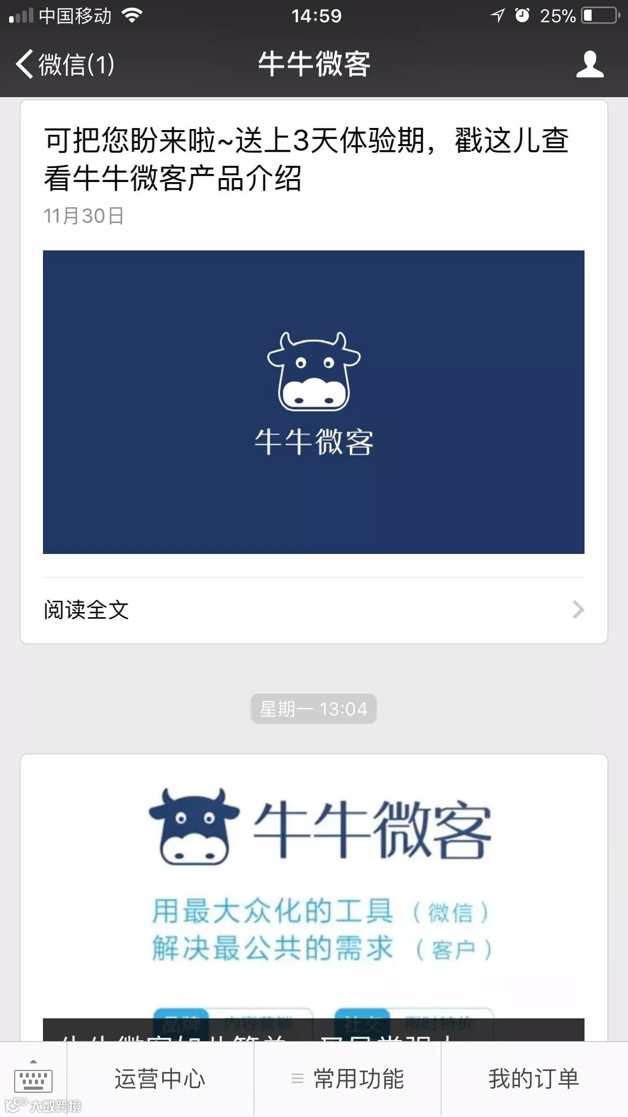在微信中,搜索牛牛微客,关注牛牛微客,您即可获得三天的免费使用时间,点击公众号“运营中心”菜单,即可进入牛牛微客运营中心,进行使用。