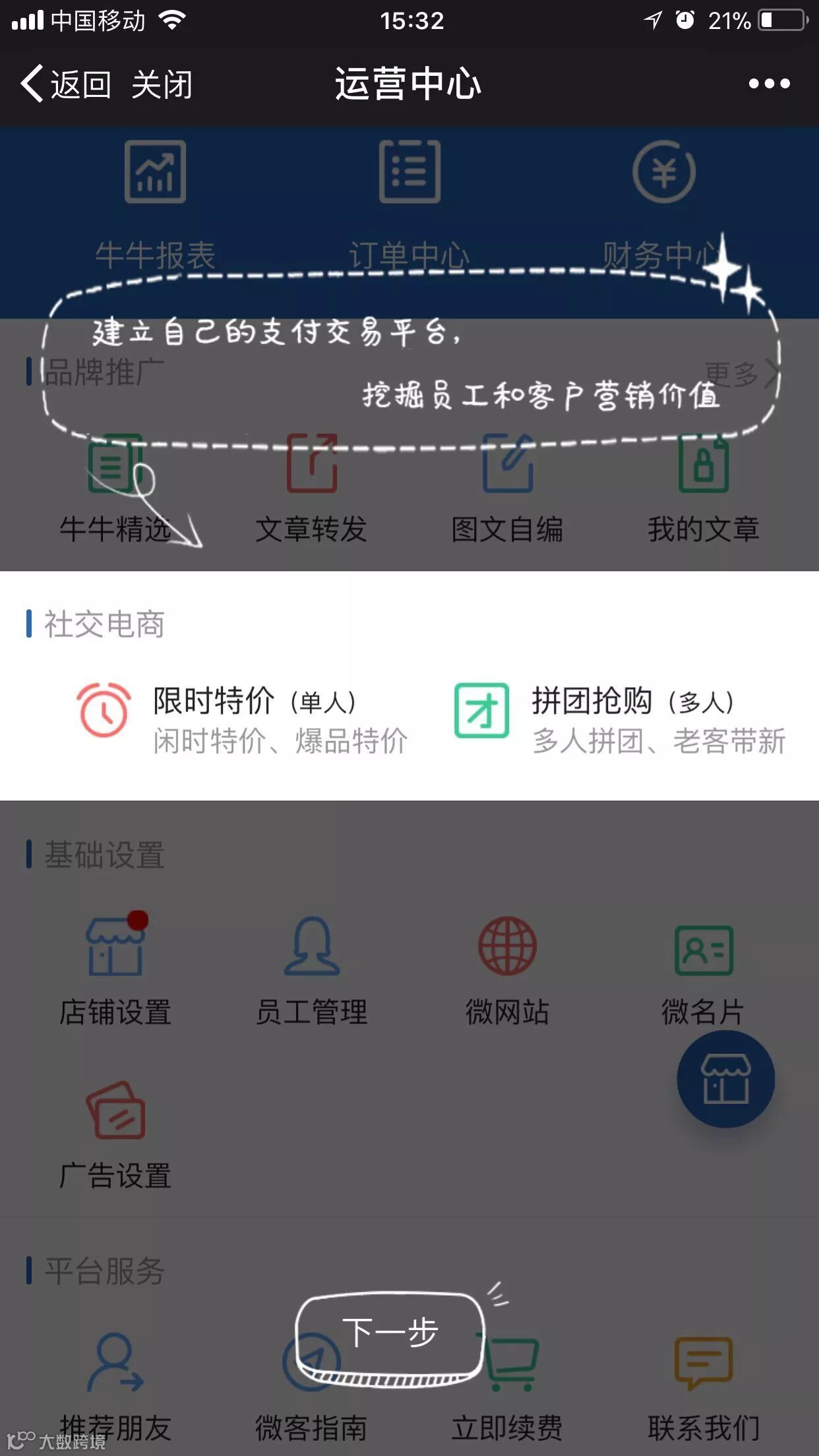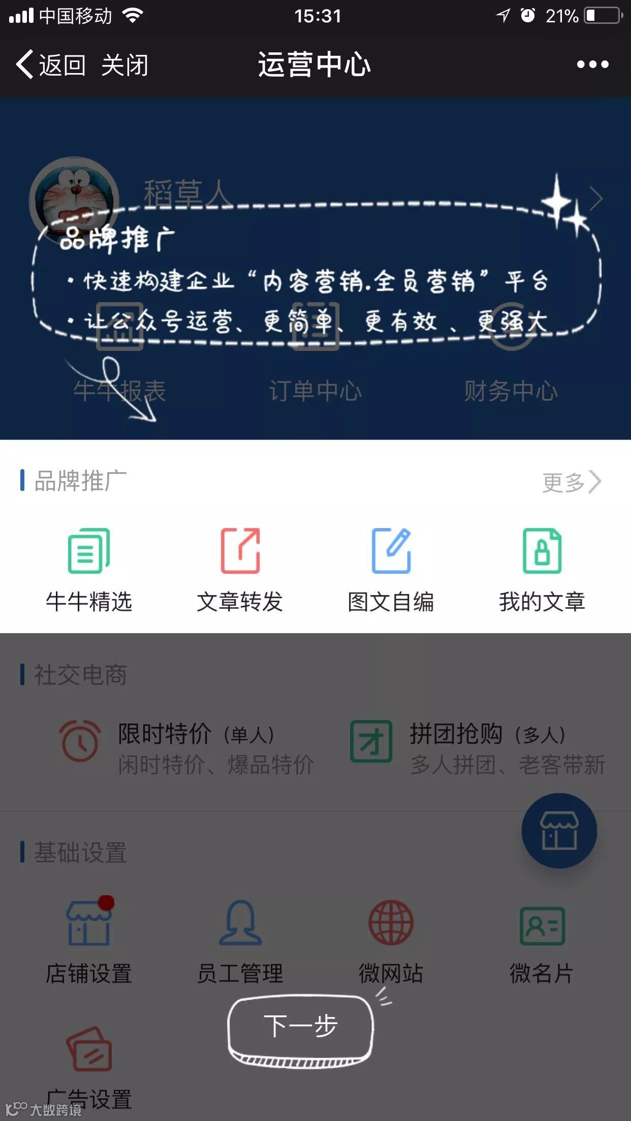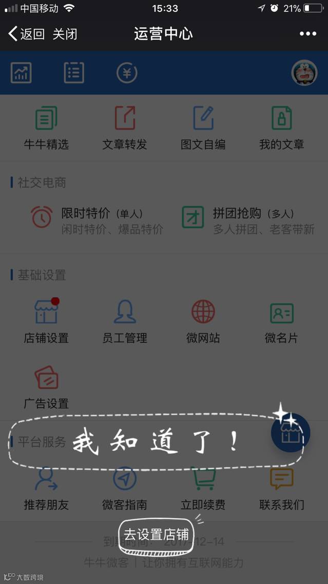 牛牛微客,为新关注的用户,进行功能引导,让新用户快速了解运营中心的功能模块,并引导新用户快速设置,进行使用。