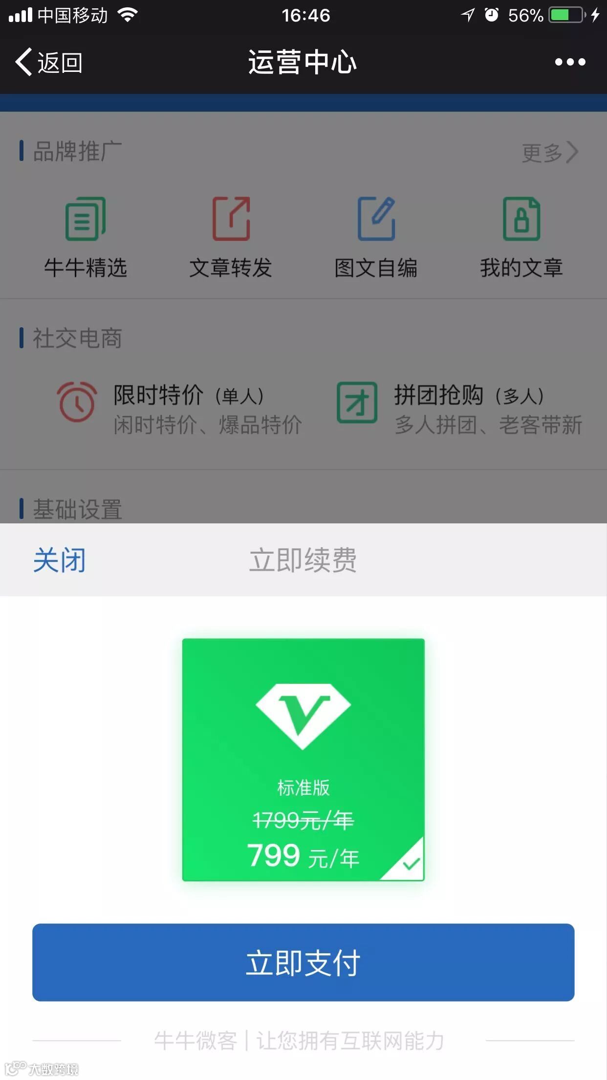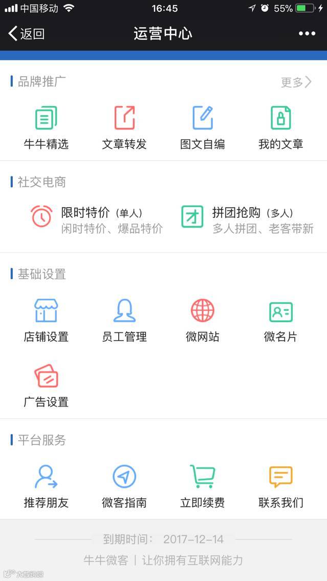 新用户关注牛牛微客,仅仅能获得三天的试用期,要是您想继续使用牛牛微客,您可以进行续费,只需要在“运营中心”,点击立即续费即可续费一年。