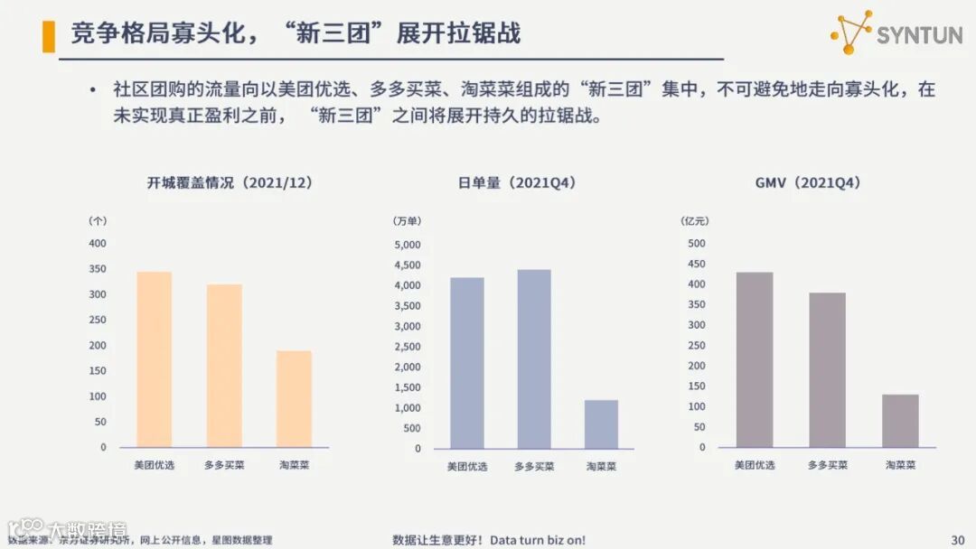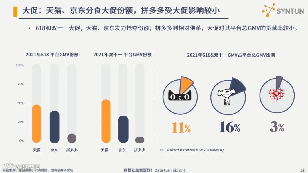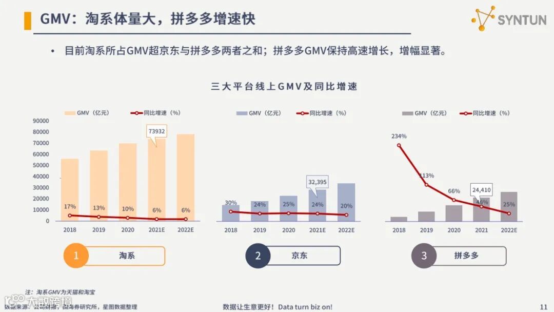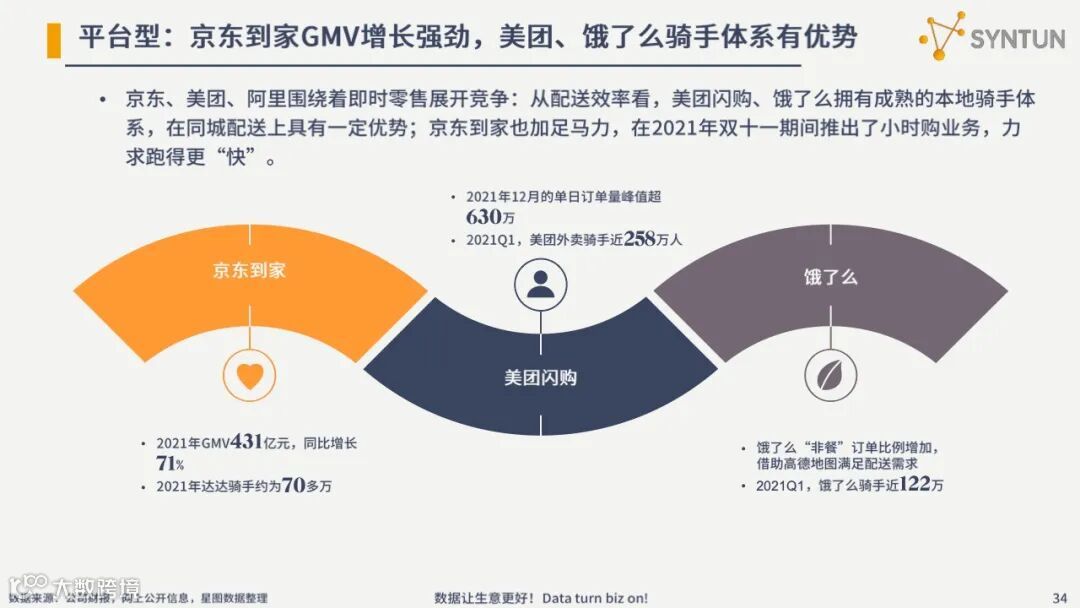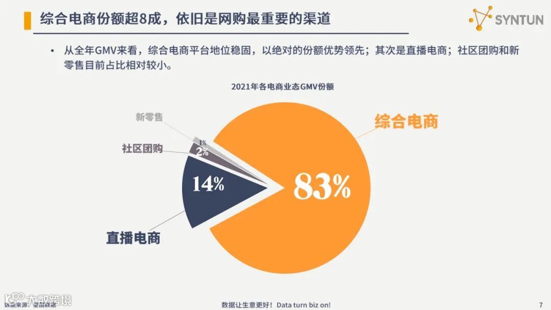 2021年,电商行业呈高开低走之势,逐渐从野性回归理性。全年GMV数据显示,综合电商平台依然是当前电商行业的绝对龙头,份额优势明显,占比高达83%,其次是直播电商,占比14%、社区团购,占比2%和新零售,占比1%。
