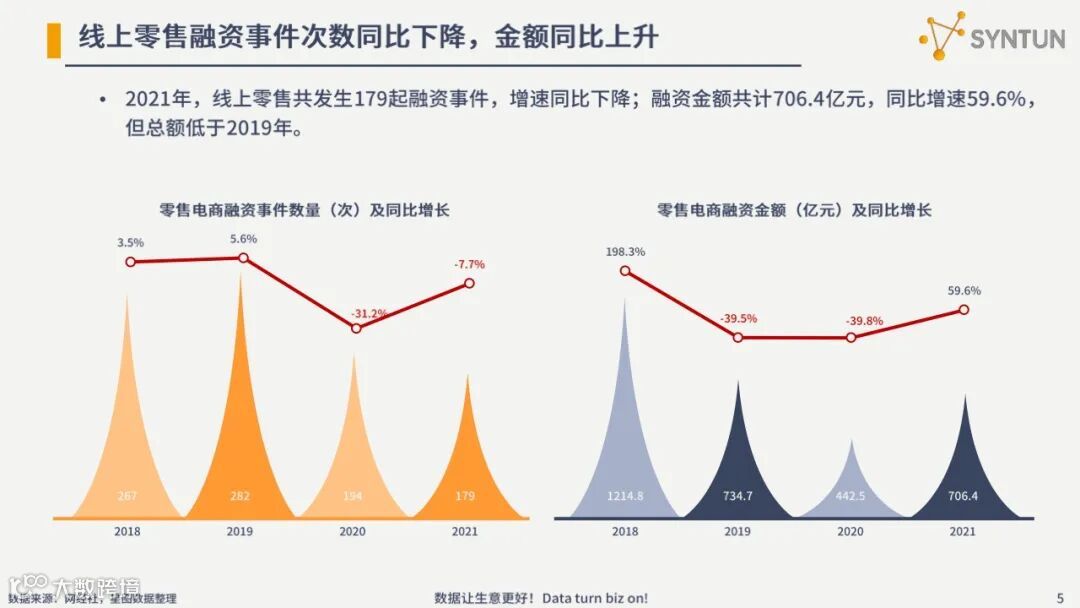 报告数据显示,2021年,我国线上零售总额为13.1万亿元,同比增长14.1%,高于市场整体增速。融资方面,2021年,累计发生融资事件179起,较2020年的194起融资事件,再次下降7.7%,但融资金额却从2020年的442.5亿元增长至2021年的706.4亿元,同比增长59.6%,虽然融资金额提升较多,但仍未恢复疫情前的水准。