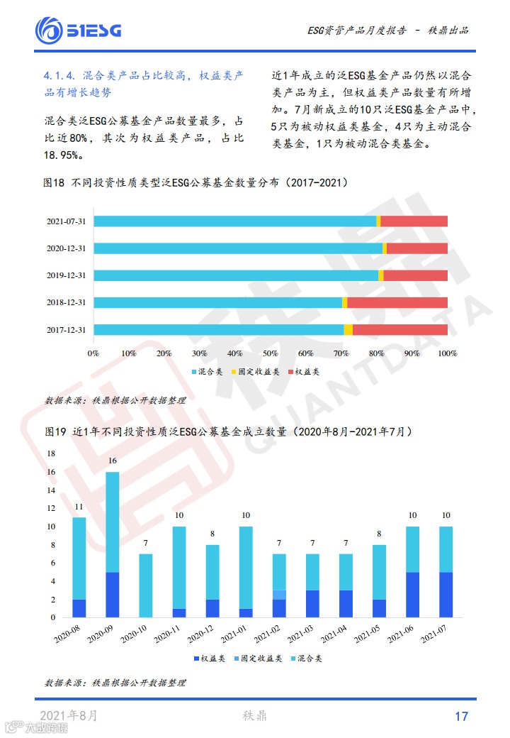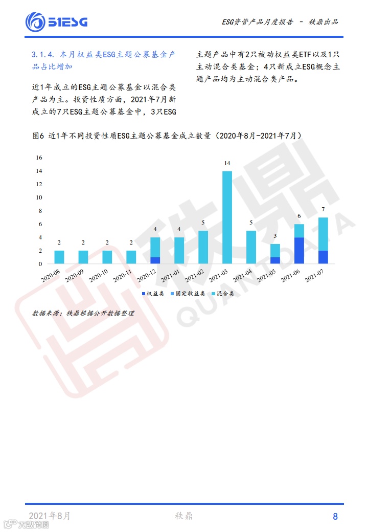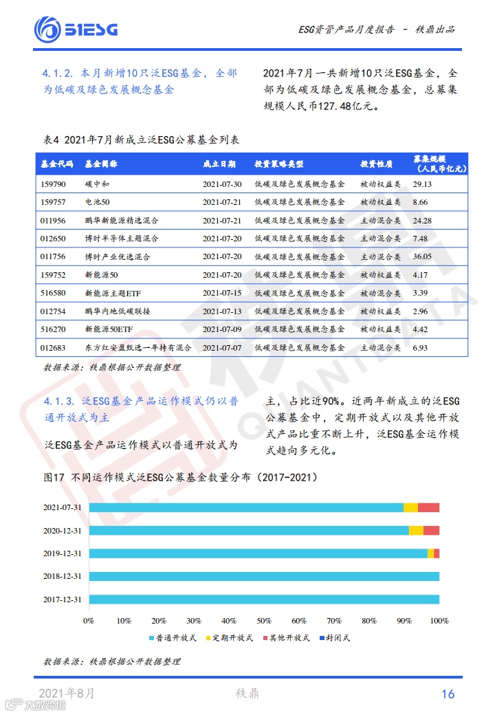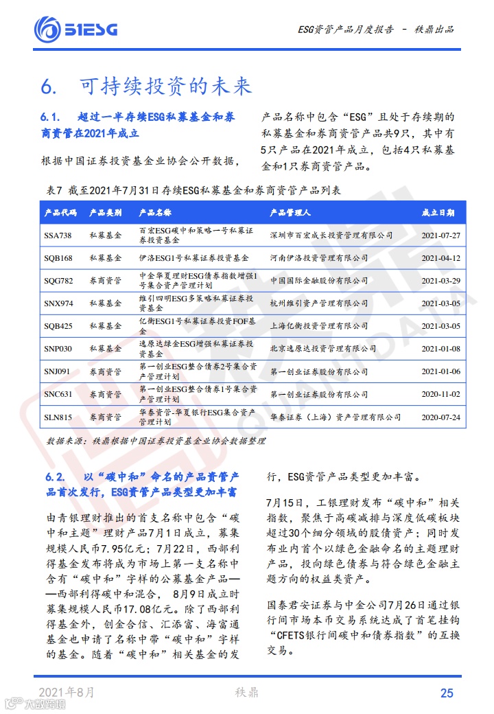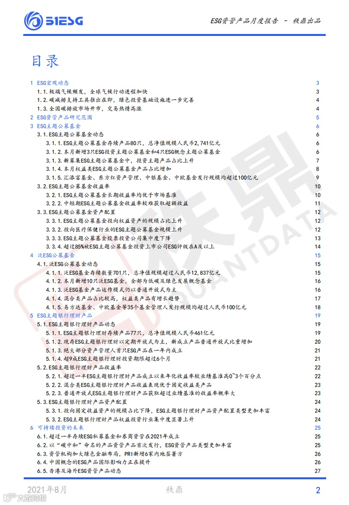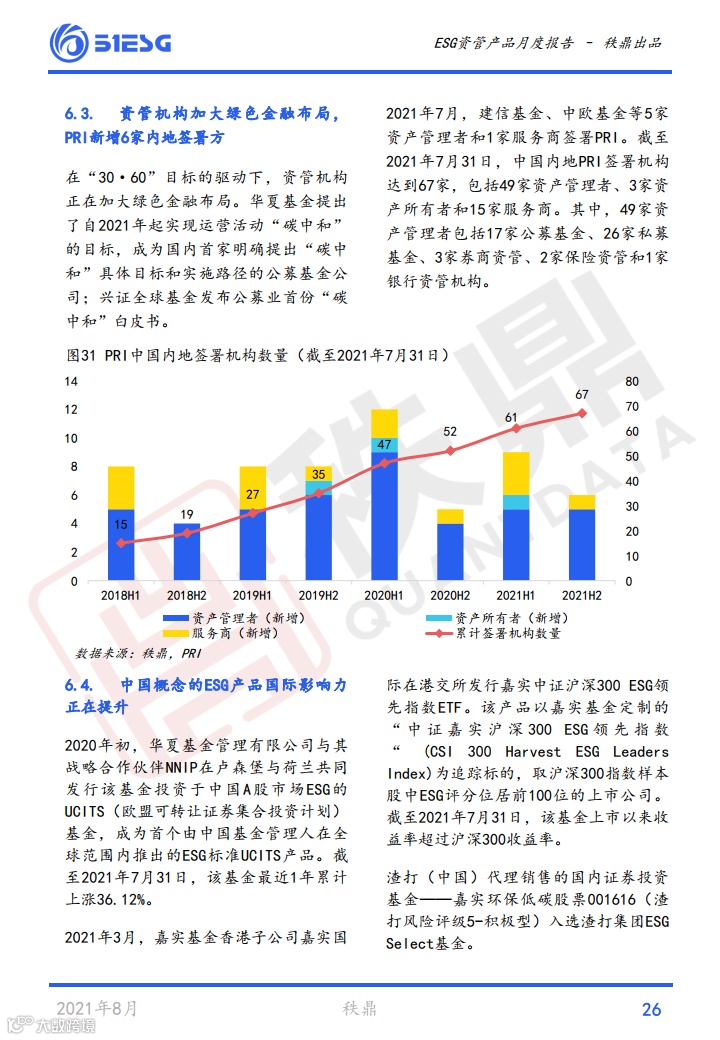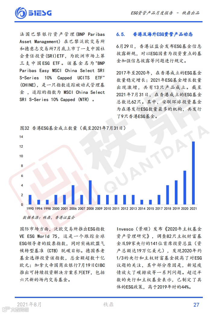 ESG投资趋势:首支“碳中和”命名的银行理财产品和公募基金发行,ESG资管产品类型更加丰富;资管机构加大绿色金融布局,PRI新增6家内地签署方;中国概念ESG产品国际影响力正在提升;嘉实环保低碳股票001616(渣打风险评级5-积极型)入选渣打集团ESG Select基金;法国巴黎银行资产管理上市欧洲市场上第三支中国ESG ETF;港交所发布ESG基金信息披露标准,在港成立的ESG基金共62只。