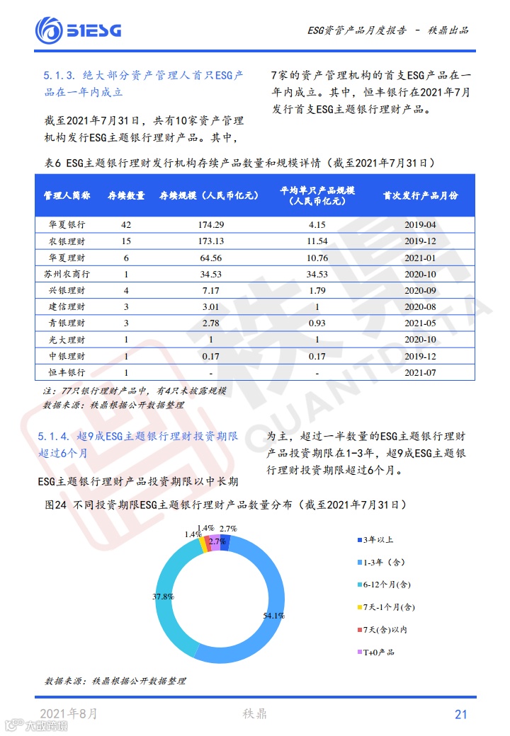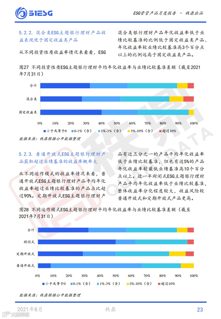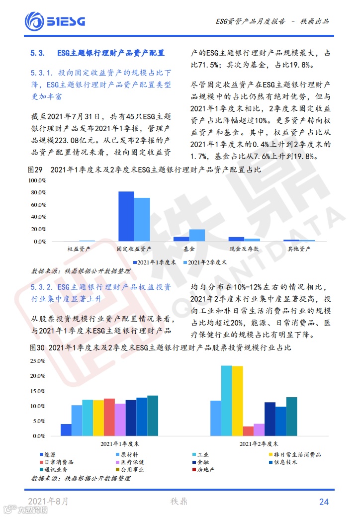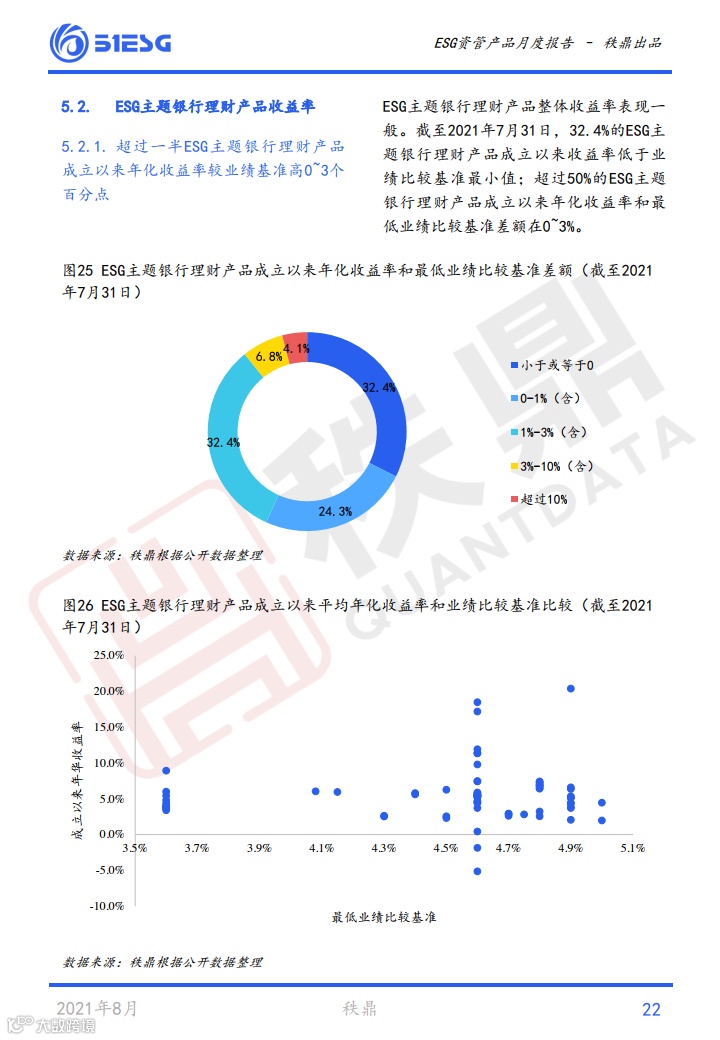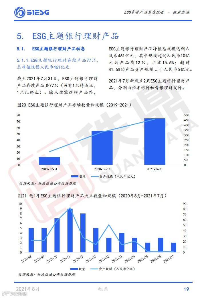 ESG银行理财产品:存续产品77只,总净值规模人民币461亿元;2021年7月新发2只产品;超过一半产品成立以来年化收益率较业绩基准高0-3个百分点;混合类ESG银行理财产品收益表现优于固定收益类产品;2021年2季度末投向固定收益资产的规模占比下降,资产配置类型更加丰富,但权益投资行业集中度上升。