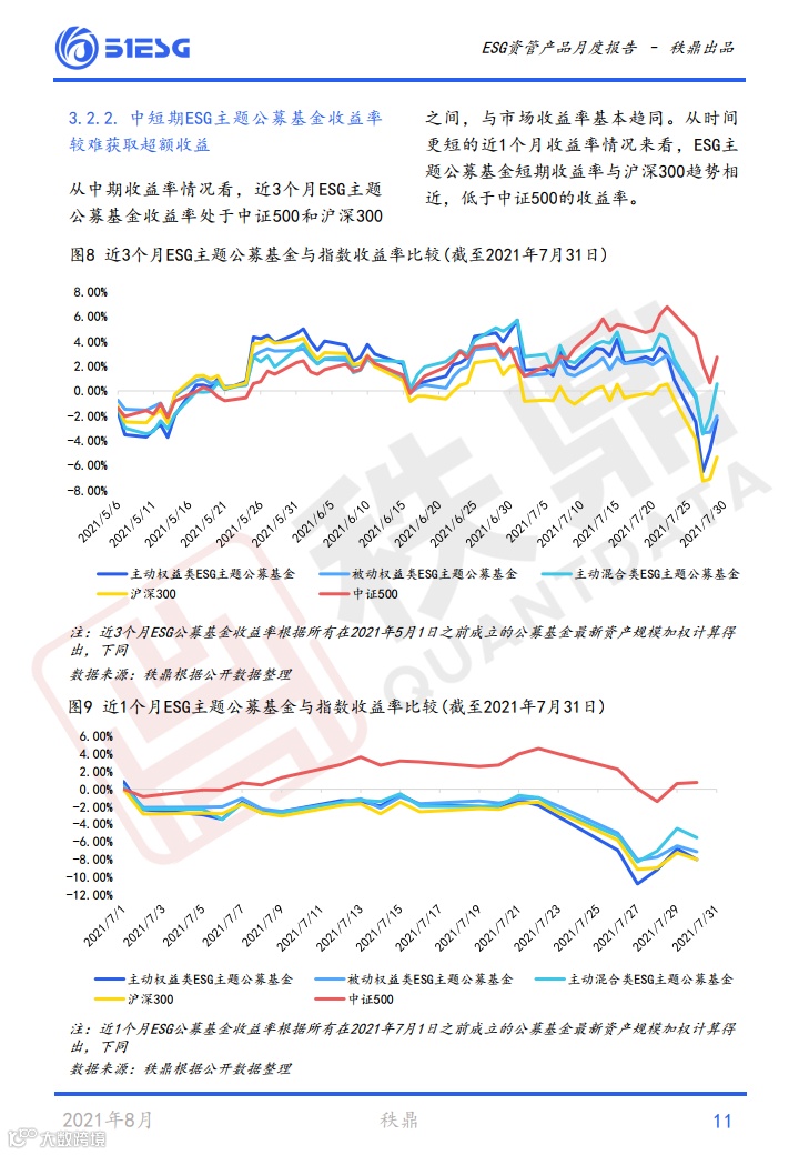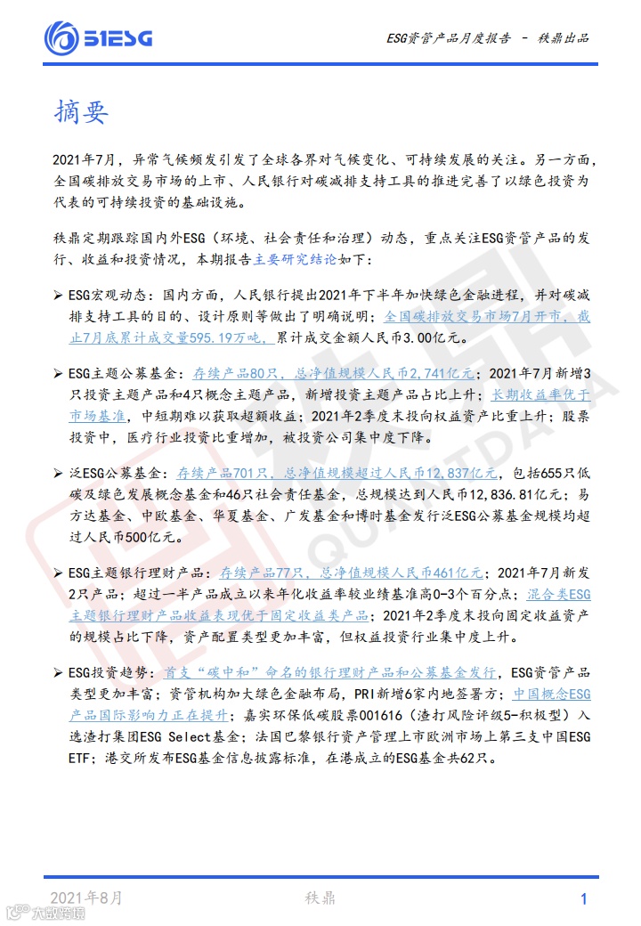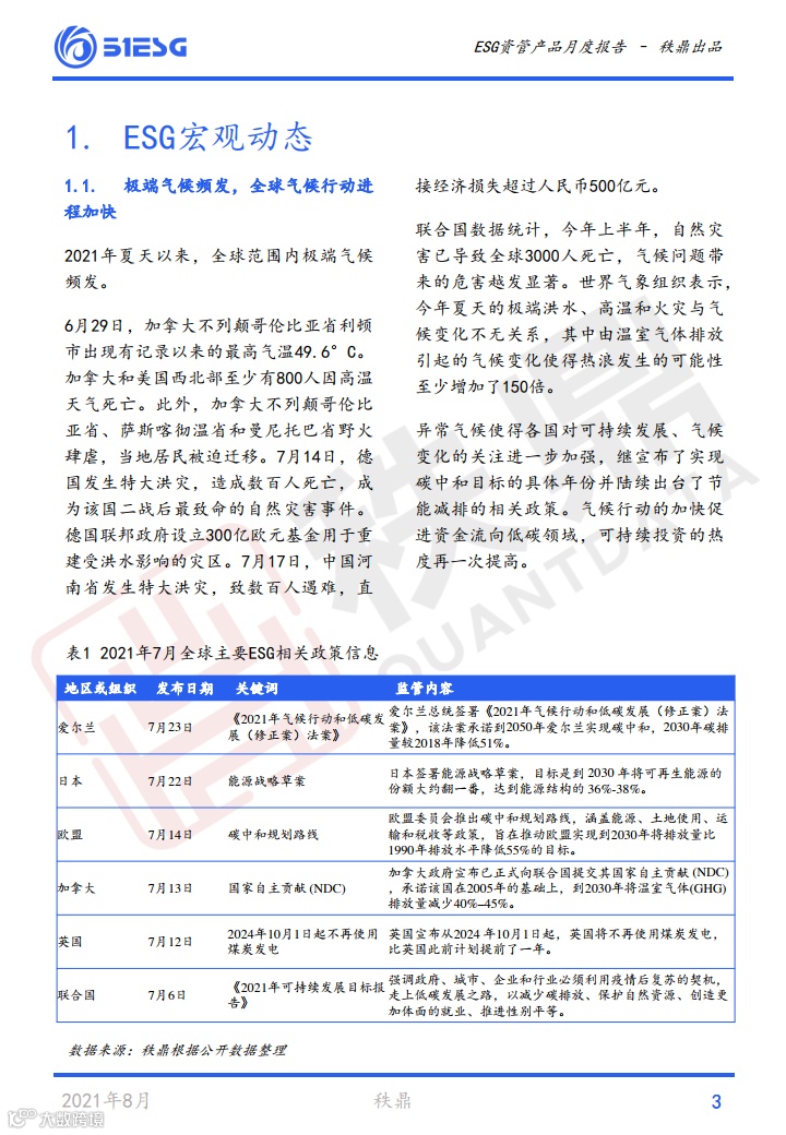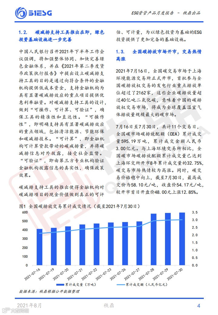 ESG宏观动态:国内方面,人民银行提出2021年下半年加快绿色金融进程,并对碳减排支持工具的目的、设计原则等做出了明确说明;全国碳排放交易市场7月开市,截止7月底累计成交量595.19万吨,累计成交金额人民币3.00亿元。