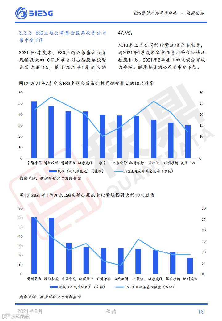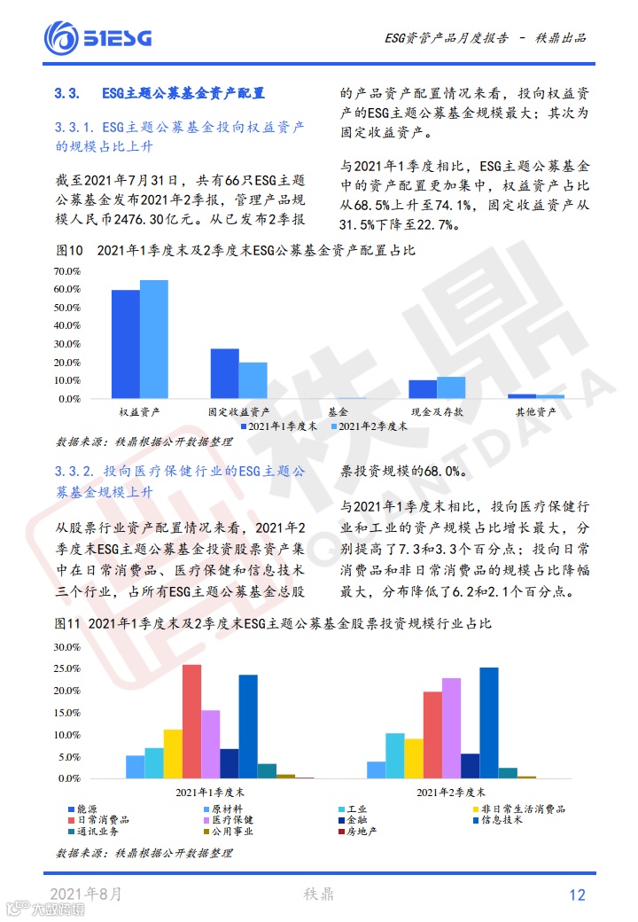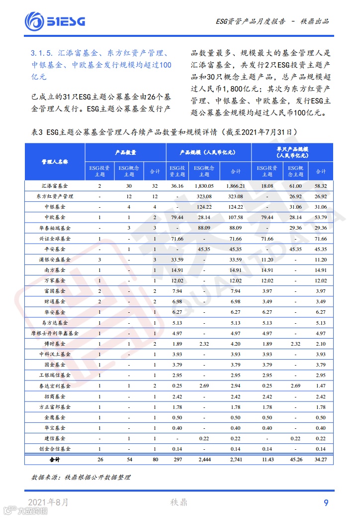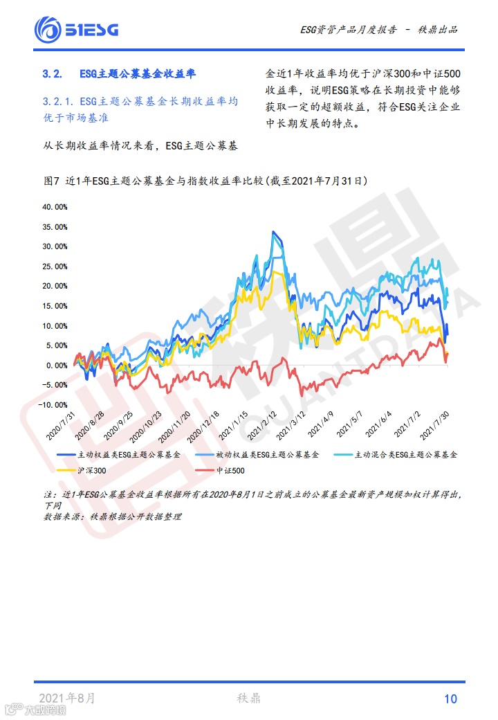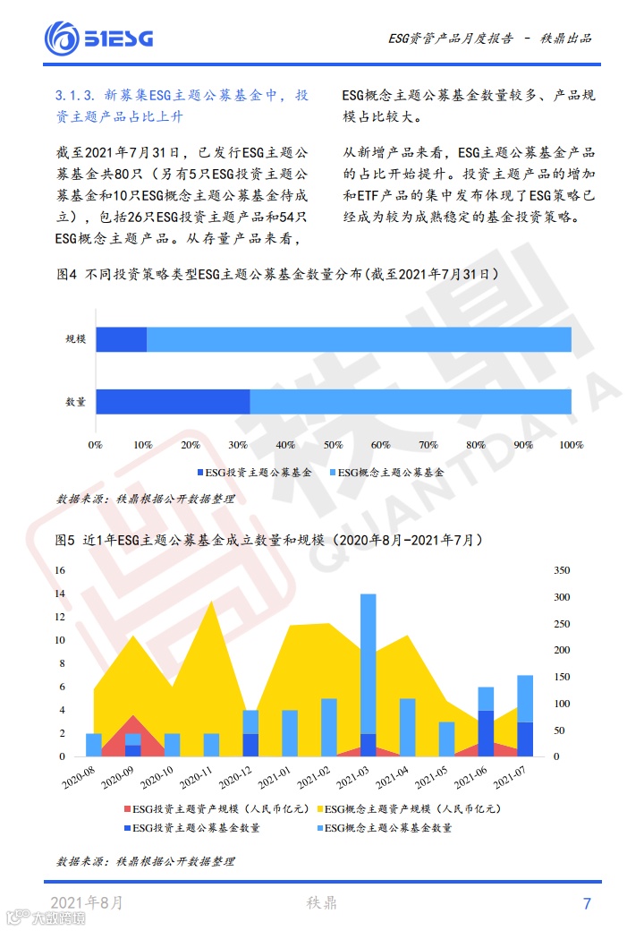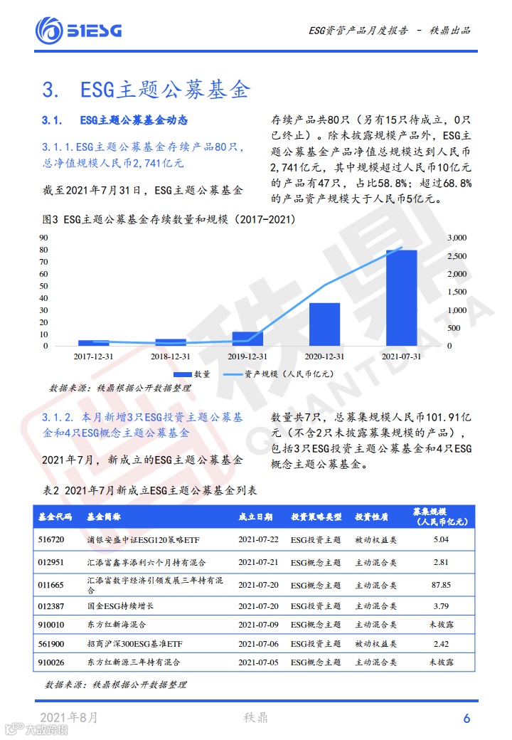 ESG主题公募基金:存续产品80只,总净值规模人民币2,741亿元;2021年7月新增3只投资主题产品和4只概念主题产品,新增投资主题产品占比上升;长期收益率优于市场基准,中短期难以获取超额收益;2021年2季度末投向权益资产比重上升;股票投资中,医疗行业投资比重增加,被投资公司集中度下降。