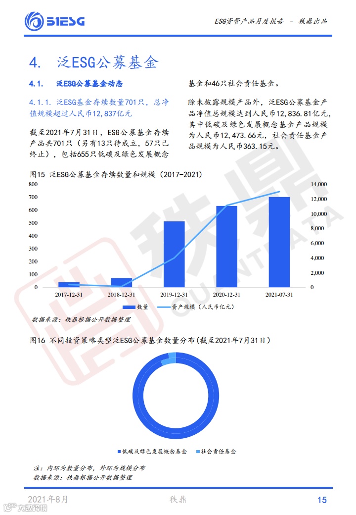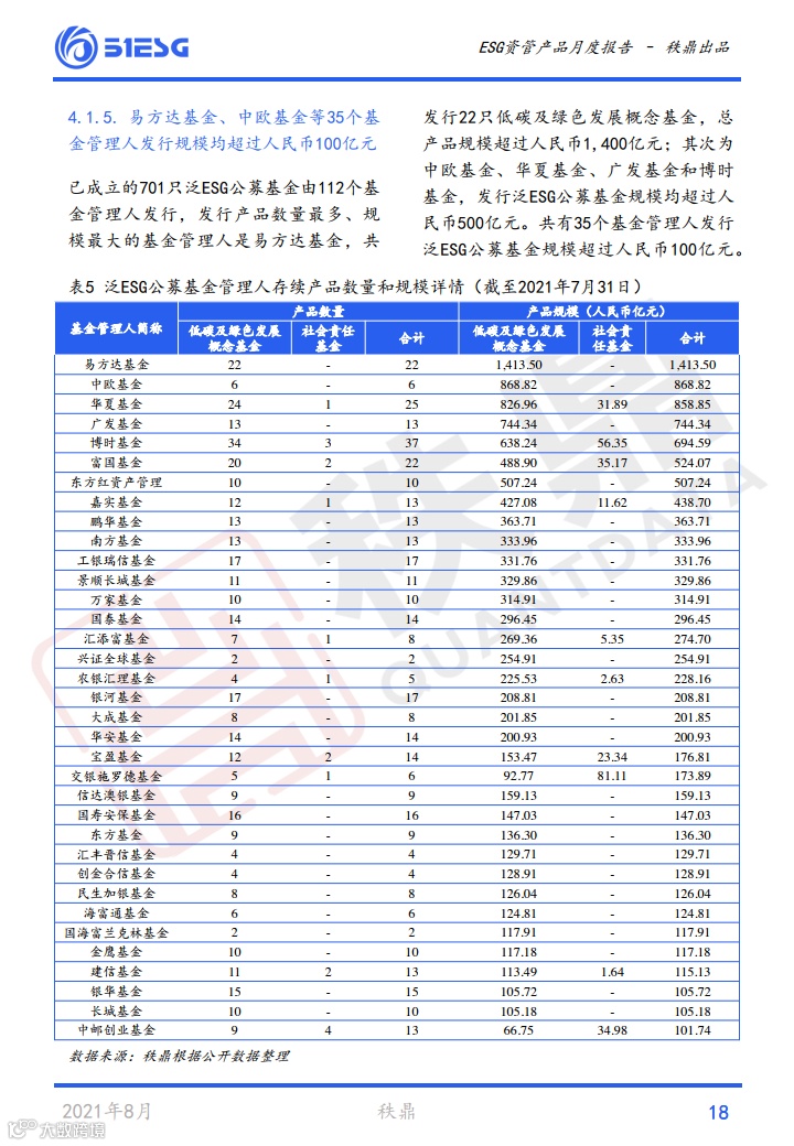 泛ESG公募基金:存续产品701只,总净值规模超过人民币12,837亿元,包括655只低碳及绿色发展概念基金和46只社会责任基金,总规模达到人民币12,836.81亿元;易方达基金、中欧基金、华夏基金、广发基金和博时基金发行泛ESG公募基金规模均超过人民币500亿元。
