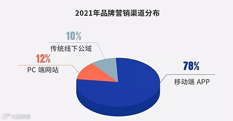 根据数据显示,2020年实物商品网上零售额达到了9.759万亿元,占社会消费品零售总额比重上升到24.9%,接近四分之一。另外,据调查数据,2021年品牌营销渠道分布统计中,移动端APP和PC端网站(电商类、搜索类)等线上渠道合计占比达到9成,而纸媒、电视、地铁等传统线下公域仅占1成。