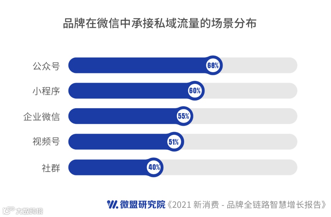 不少新消费品牌通过微信生态内的私域工具迅速崛起,营销ROI在15天提升25%,30天提升47%,以及60天提升67%。其中值得注意的是,公众号和小程序成为微信生态内私域运营的主要沉淀工具,通过公众号、小程序等场景进行私域沉淀的品牌,占比分别达68%和60%。