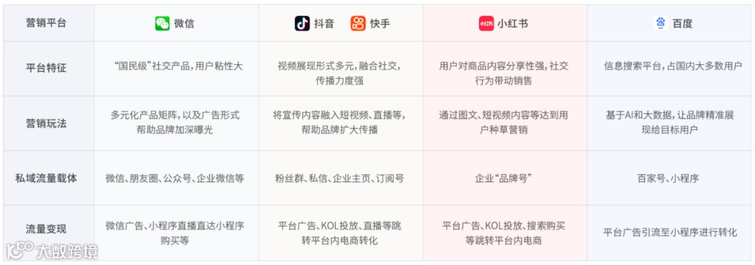 目前,国内线上营销主流平台为微信、抖音、快手、小红书、微博、百度等,每个平台之间在差异化竞争过程中逐渐形成自己的特色,针对不同用户群体,其规则、玩法都存在差异化。比如,小红书作为分享性、垂直性强的社区平台,侧重于通过图文、视频内容带动销售。相反微信以社交网络构建的流量池体量足够大,用户粘性强,能够为长效品牌价值运营提供有利条件。