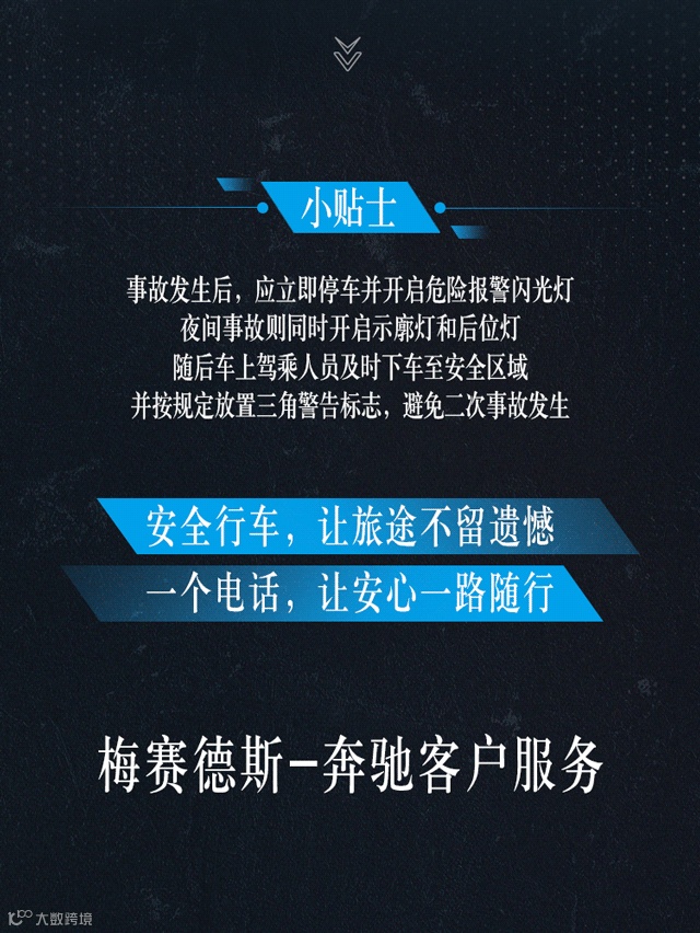 *当车辆遭遇交通事故(包括由于地震、台风、山洪、雷击等不可抗拒的自然灾害造成的损失)不能正常行驶时,拨打梅赛德斯-奔驰事故救援24小时免费热线400-650-4688 (针对乘用车),即可及时获得专业的援助。