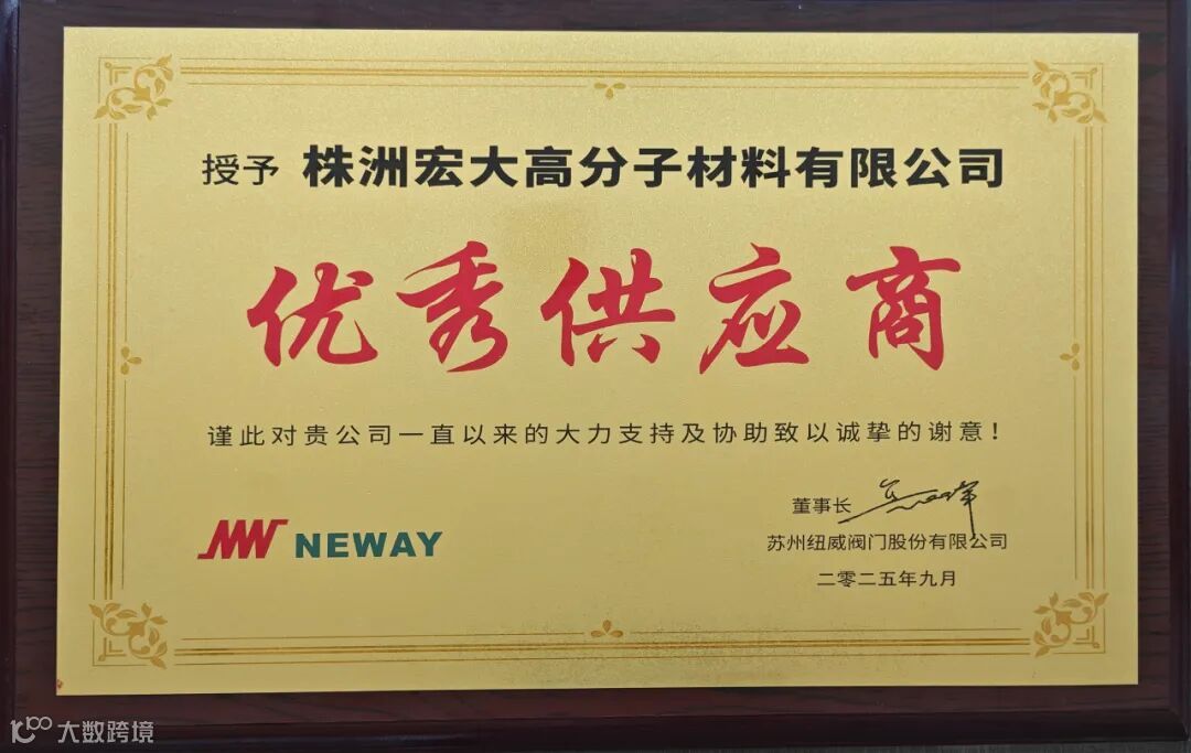 近日,中国阀门行业领军企业纽威阀门有限公司(以下简称 “纽威阀门”)举办盛会,公布 2025 年优秀供应商名单并现场嘉奖,一众供应商中仅有10家企业获此殊荣。宏大高分子凭借卓越的软密封产品品质、高效的技术服务能力以及对严苛标准的极致践行,成为唯一斩获 “优秀供应商”的软密封供应商!这不仅是纽威阀门对宏大高分子综合实力的高度认可,更标志着彼此双方在长期合作中构建的信任伙伴关系迈入新高度!