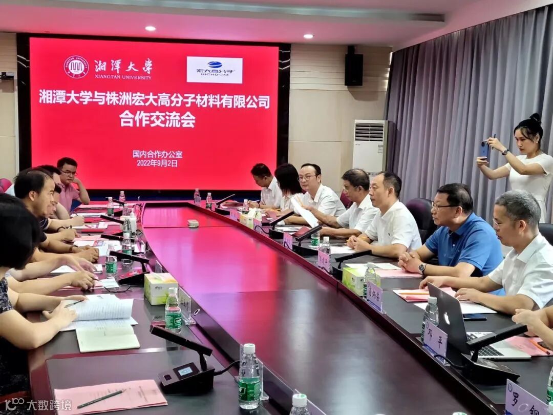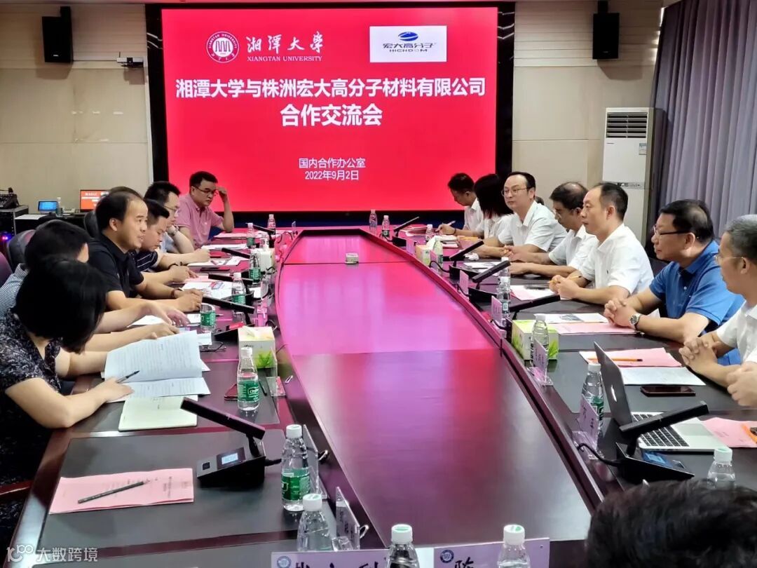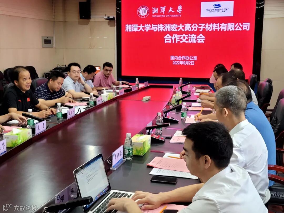 2022年9月2日,湘潭大学与株洲宏大高分子材料有限公司就产学研战略合作相关内容进行了深入的交流。本次合作交流会由湘潭大学副校长盛明科主持,株洲宏大高分子材料有限公司(以下简称“宏大高分子”)董事长曾维楚、科技管理顾问肖建平、总工程师肖炳荣等参与会议并就相关合作事宜进行深入探讨。