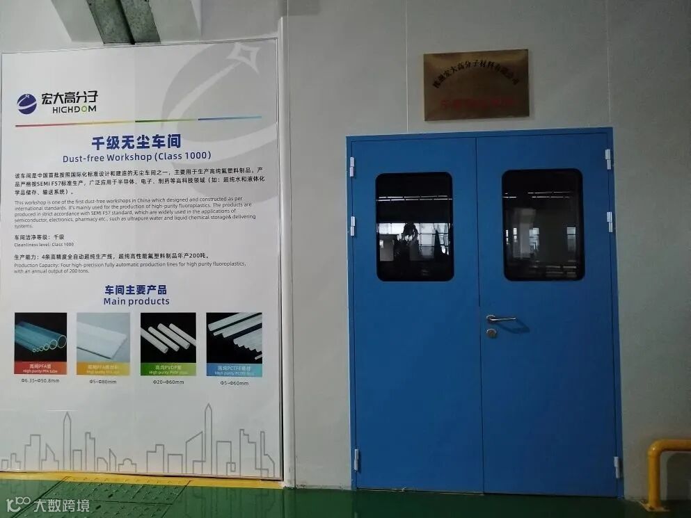宏大高分子的千级无尘车间严格按SEMIF57标准生产,是按照国际化标准设计和建造的无尘车间,主要用于生产高纯氟塑料制品。考察团了解到:该车间拥有4条高精度全自动超纯生产线。经第三方检测,产品质量达到SEMI F57标准及以上水平。目前主要产品为Φ6.35~Φ50.8mm高纯PFA管、Φ5~Φ80mm高纯PFA棒材、Φ20~Φ63mm高纯PVDF管、高纯PCTFE棒材Φ5~Φ60mm等,广泛应用于半导体、电子、制药等高科技领域。