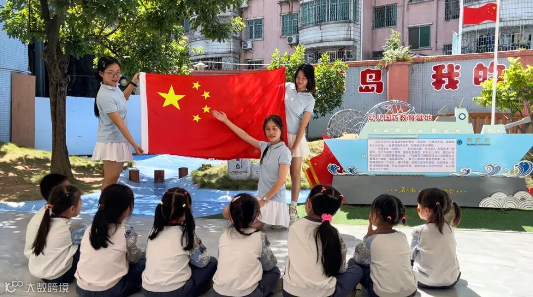 托育中心老师在国防教育基地向幼儿讲述国旗的故事