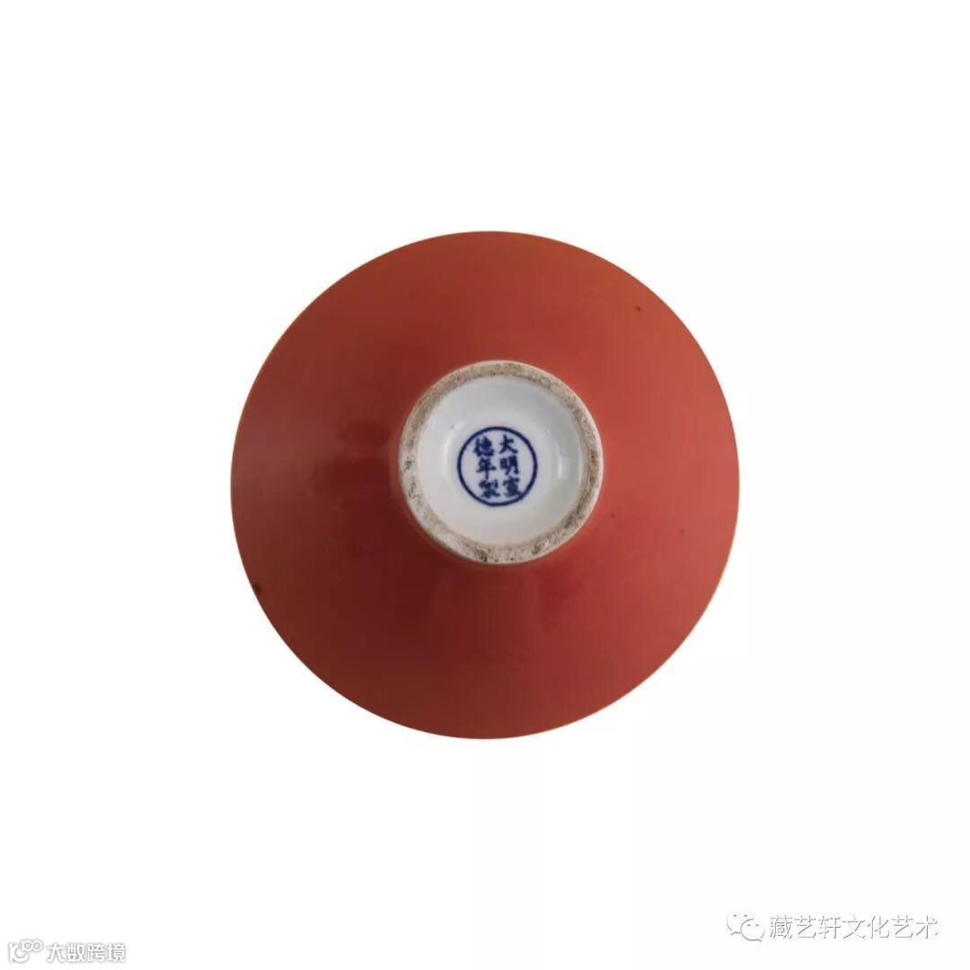 此件清仿宣德斗笠碗广口,斜腹壁呈四十五度角,小圈足,碗底落款为大明宣德年制,因倒置过来形似斗笠,故名为斗笠碗。碗身外施以红釉,外釉未到底足,露涩胎,釉面光亮坚致,变幻光泽,有自然垂流状。碗内为青花绘缠枝花纹,花纹施以蛇皮绿、鳝鱼黄,朱砂红三种颜色釉,花枝蔓纤细舒卷,胫部加饰变形花瓣纹一周,用笔刚劲流畅,构图疏朗清雅,青花发色纯正,鲜丽明快。