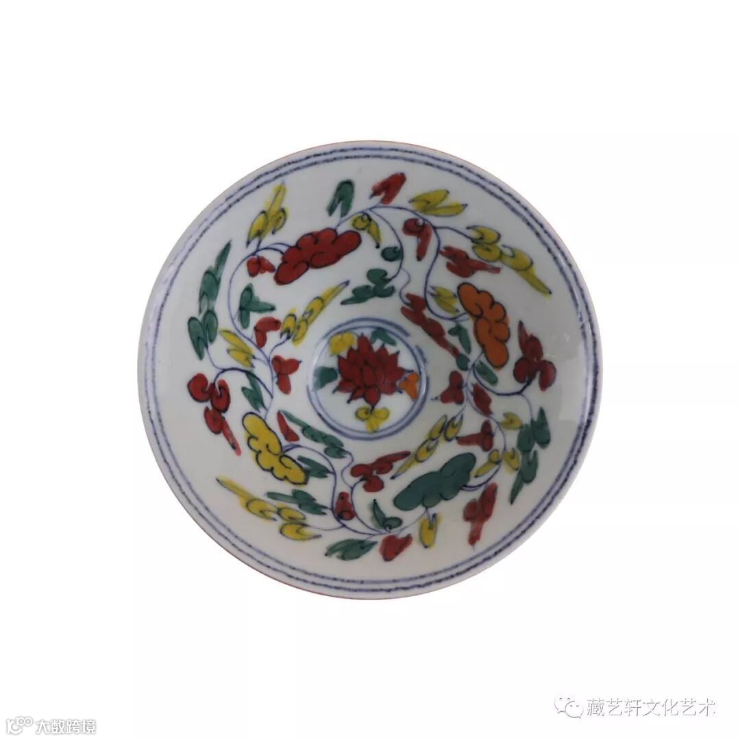 This Qing imitation of Xuande Douli bowl has a wide mouth, oblique abdominal wall with 45 degrees angle, small circle feet, and the bottom of the bowl is the Xuande year system of Daming. It is named Douli bowl because it resembles Douli when it is inverted. Red glaze is applied outside the bowl body. The outer glaze is not at the end of the bowl. The glaze is bright and firm, with varying luster and natural vertical flow. The bowl is painted with blue and white twining patterns. The patterns are glazed with snakeskin green, eel yellow and cinnabar red. The branches are slender and coiled. The shank is decorated with deformed petal patterns for one week. The composition is clear and elegant. The blue and white flowers are pure in color and bright and lively.