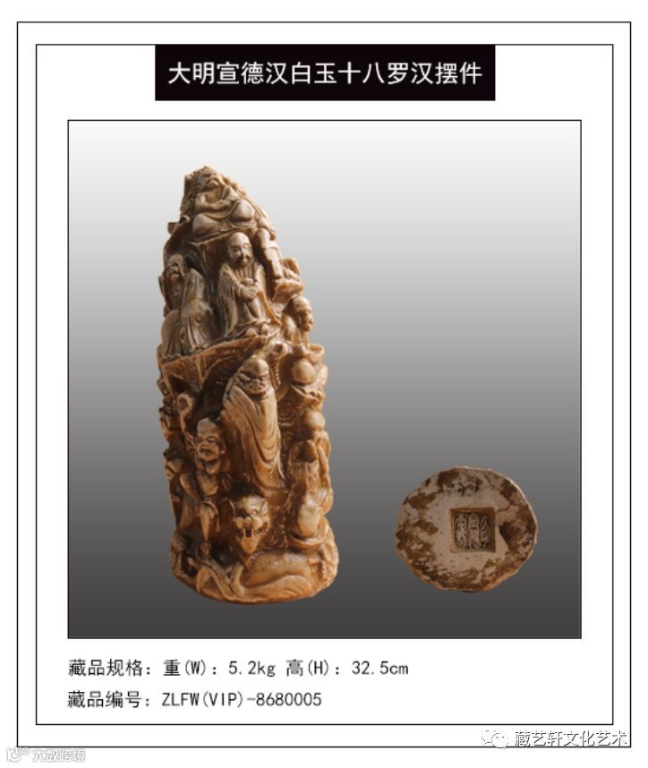 This Daming Xuande Han Baiyu 18 Arhat ornament, exquisite craftsmanship, engraved at the bottom of the word "Daming Xuande Year System", solid and delicate quality of Han Baiyu. The shape of the decorative figure is deep and simple, echoes from the elevation, vivid and vivid, with a balanced body proportion, full of vivid posture and magnificent sculptor. The whole work has extraordinary momentum, exquisite craftsmanship, exquisite sculpture, showing a royal style, with a very high artistic value for planting and collecting.