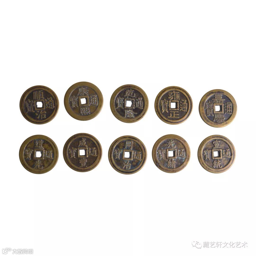 此“清代十帝币”一组。藏品分别为“顺治通宝”、“康熙通宝”、“乾隆通宝”、“雍正通宝”、“嘉庆通宝”、“道光通宝”、“咸丰通宝”、“同治通宝”、“光绪通宝”和“宣统通宝”。十枚钱币均为圆形方孔,从色泽上不易判断,十枚钱币经历了漫长的岁月,轮廓分明,光泽自然,独具特色,与众不同,各有千秋。十帝钱相传还有着众多的的作用和功效,铜质的十帝钱五行属金,铜能吸收更多的能量,相较于金银效果更加,因此十帝铜钱拥有很强的化解煞气的作用,极具收藏价值。