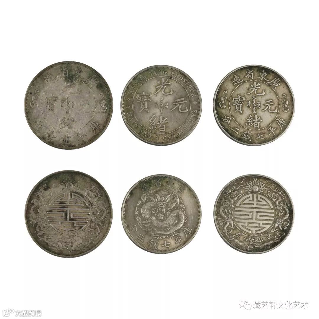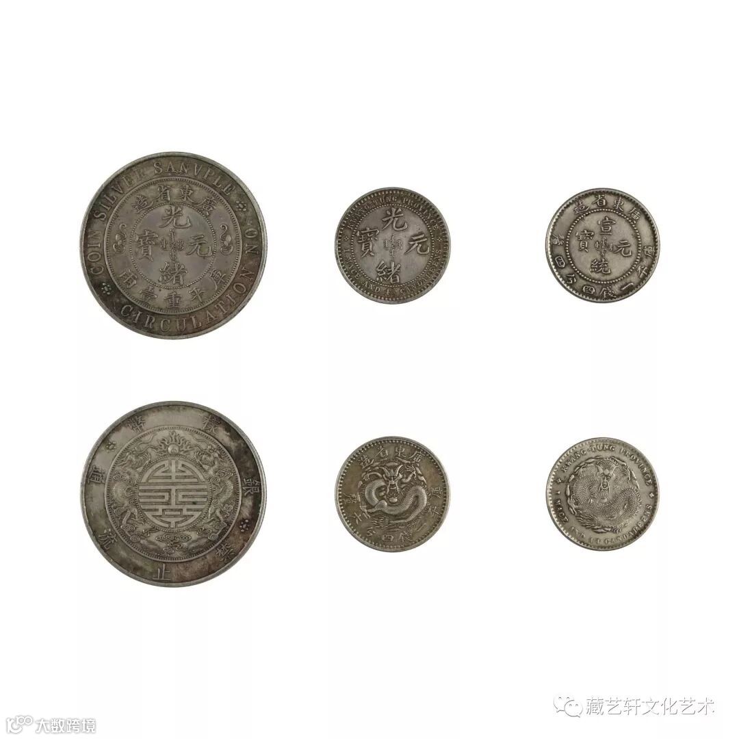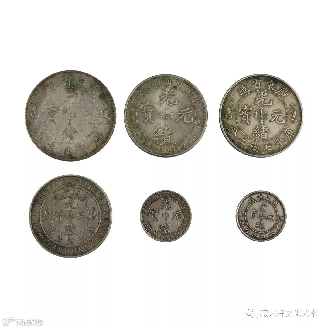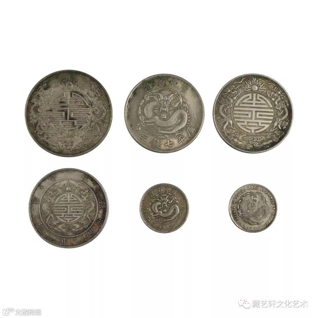 此六枚一组钱币分别为广东省造光绪元宝库平重一两双龙寿字币,广东省造光绪元宝库平七钱三分,广东省造光绪元宝库平七钱二分双龙寿字币,广东省造光绪元宝库平重壹两双龙寿字币样板币,广东省造光绪元宝库平一钱四分六厘和广东省造宣统元宝库平一钱四分四厘。