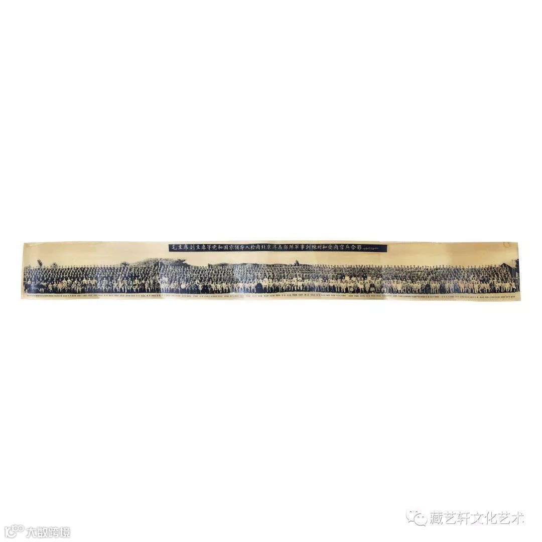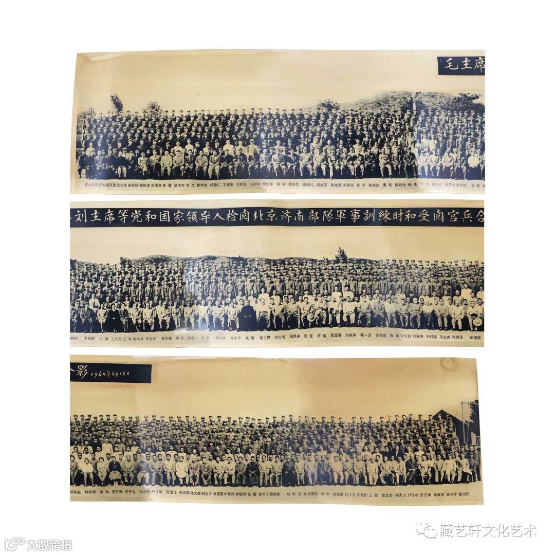 此藏品为1964年6月15日毛主席刘主席等党和国家领导人检阅北京济南部队军事训练时和受检官兵合影。泛黄的牛皮纸材质,为数不多的高级老领导人的合照,是老一辈无产阶级革命家的珍贵影像资料。本照片长262cm宽30.7cm,94位第一代领导人及官兵近1000人,场面极为壮观震撼。是收藏纪念馈赠的绝佳藏品。