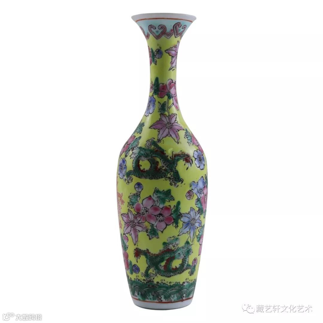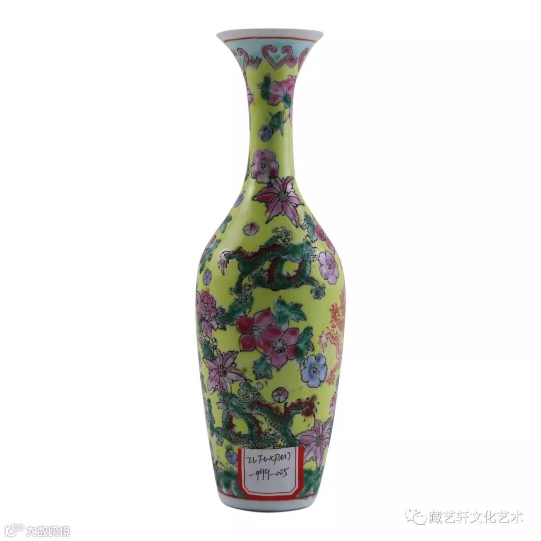 此大清乾隆黄釉赏瓶,造型规正,圆口外撇,颈修长,溜肩下渐敛,圈足。为典型乾隆时期赏瓶式样,但从黄釉和龙纹分析,只有皇家或皇亲国戚才能赏用此物,为突显高贵,瓶面图案更是有条红龙。瓶内及底施青白釉,外施黄釉,油亮匀称。一般情况,黄釉为低温釉且釉面玻化程度高而易开片,但此瓶莹润晶亮而纹丝未裂,像永宣时期宝石红釉一样夺人眼球。