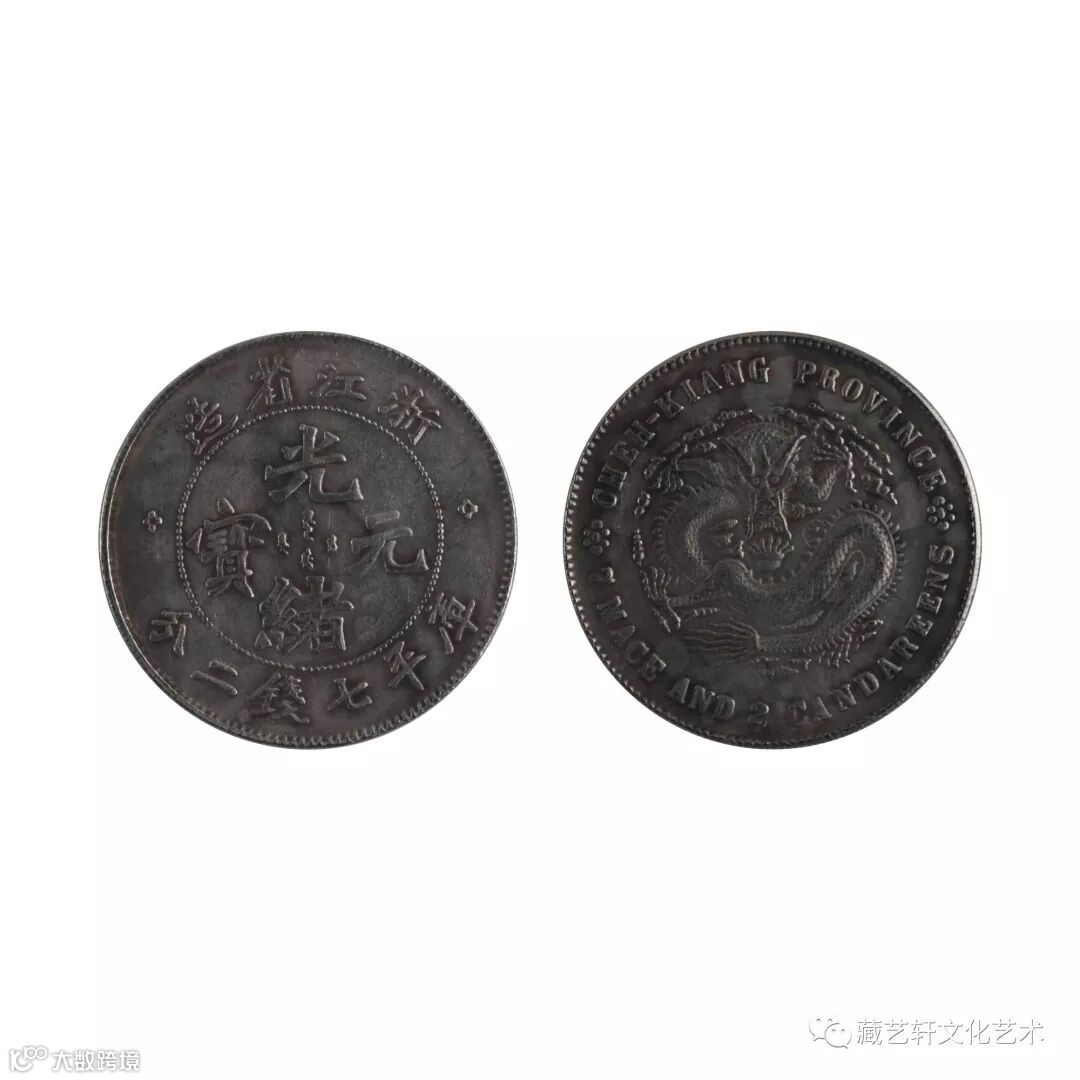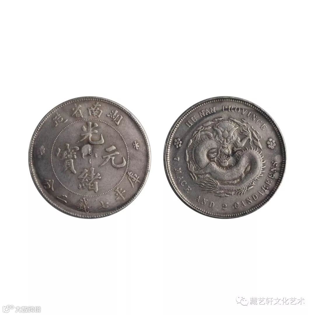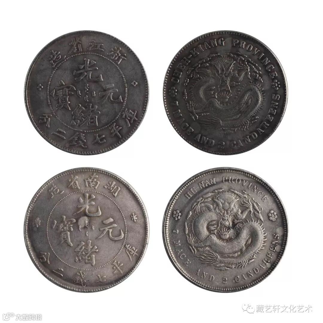 此组库平七钱二分光绪元宝,分别为浙江省造和湖南省造。钱币正面点圈内镌汉文和满文“光绪元宝”字样,上分别铸有“浙江省造”,“湖南省造”四字,下镌“库平七钱二分”六字,两旁镌花饰。背面蟠龙居中,外圈为英文,并镌有“7”和“2”阿拉伯数字,两旁镌小花饰。