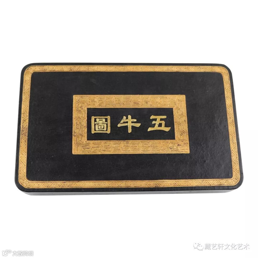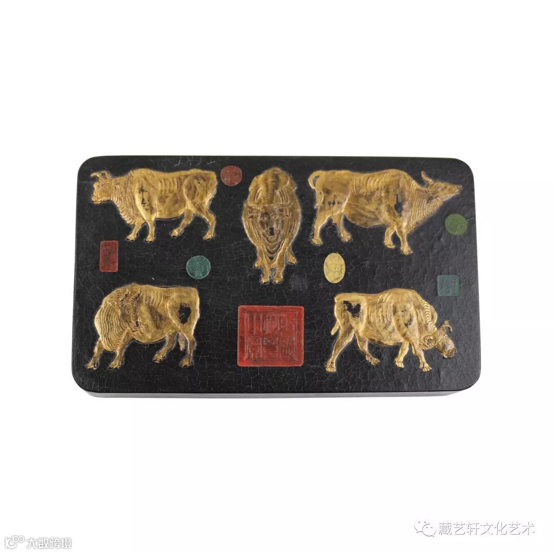 藏品以牛为表现对象。由于没有背景衬托,在构图型的安排上确实很费斟酌,要表现得非常具有特色,很不容易。画家在构图处理上通过左右对称的形式,则较为很好地处理了这一问题。中间一青牛画成正面形象,使青牛直接对向观众,视角独特,形成画面的中心,两面各安排两牛,呈对称形状,五头牛也可以相互紧密联系起来,五头牛既是单一的个体,相互之间又有着紧密的联系,由之构成了一个非常和谐的统一整体。通过它们的昂首、低头、回眸左右顾盼的动态特征,使画面不显得呆板,于彼此呼应联络中而见构图的微妙变化,从而有效地解决了构图呆板的问题。藏品年代悠长,具有极高的收藏价值。