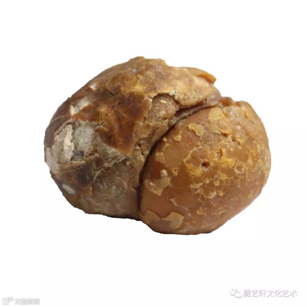 此件藏品为鸡宝,原名为鸡黄,是指鸡的胆囊结石,家鸡干燥的胆结石。此鸡宝呈卵形,质轻,表面金黄至黄褐色,细腻而有光泽。气清香,味微苦而后甜,性凉。归胃经、心经、脾经、膀胱经。内服治阳瘘、早泄、遗精、月经不调、高热神志昏迷、癫狂、小儿惊风、抽搐、食道癌、胃病、反胃等症,外用治咽喉肿痛、口疮痈肿、疔疮、疗毒症、尿毒症等,是多种良药的重要原料。