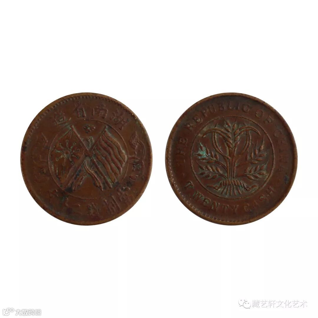 此双旗币为湖南省造双旗币当制钱二十文,为民国时期的机制钱币。钱币正面中央左为星旗、右为五色旗,两面国旗上系结带相互交叉,外缘上铸“湖南省造”四字,下铸纪值“當制钱二十文”六字,左右分列花枝。钱币背面中央为稻穗组成的嘉禾纹禾穗,纹饰别致,边缘环英文。该钱币保存较为完好,包浆浓厚,值得收藏。