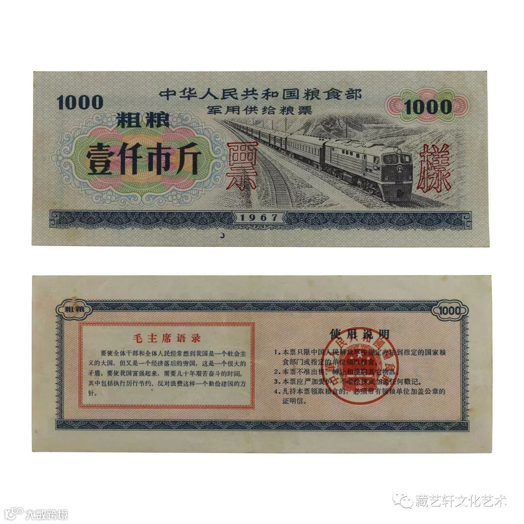此(样票)军用供给粮票壹仟市斤便是1967年版而且还是样票。粮票庄重精致,美观大方,票面图案为交通运输(火车)图,背面毛主席语录是在全国各地发行的语录粮票中之最,连标点符号在内共有100个字,是迄今在粮票上发现语录最长的粮票,主要是得益于该票票幅的巨大。该(样票)军用供给粮票带着时代特色浓厚,让收藏家们爱不释手。粮票反映了当时我军建设的珍贵历史,并且极具收藏价值和历史意义。