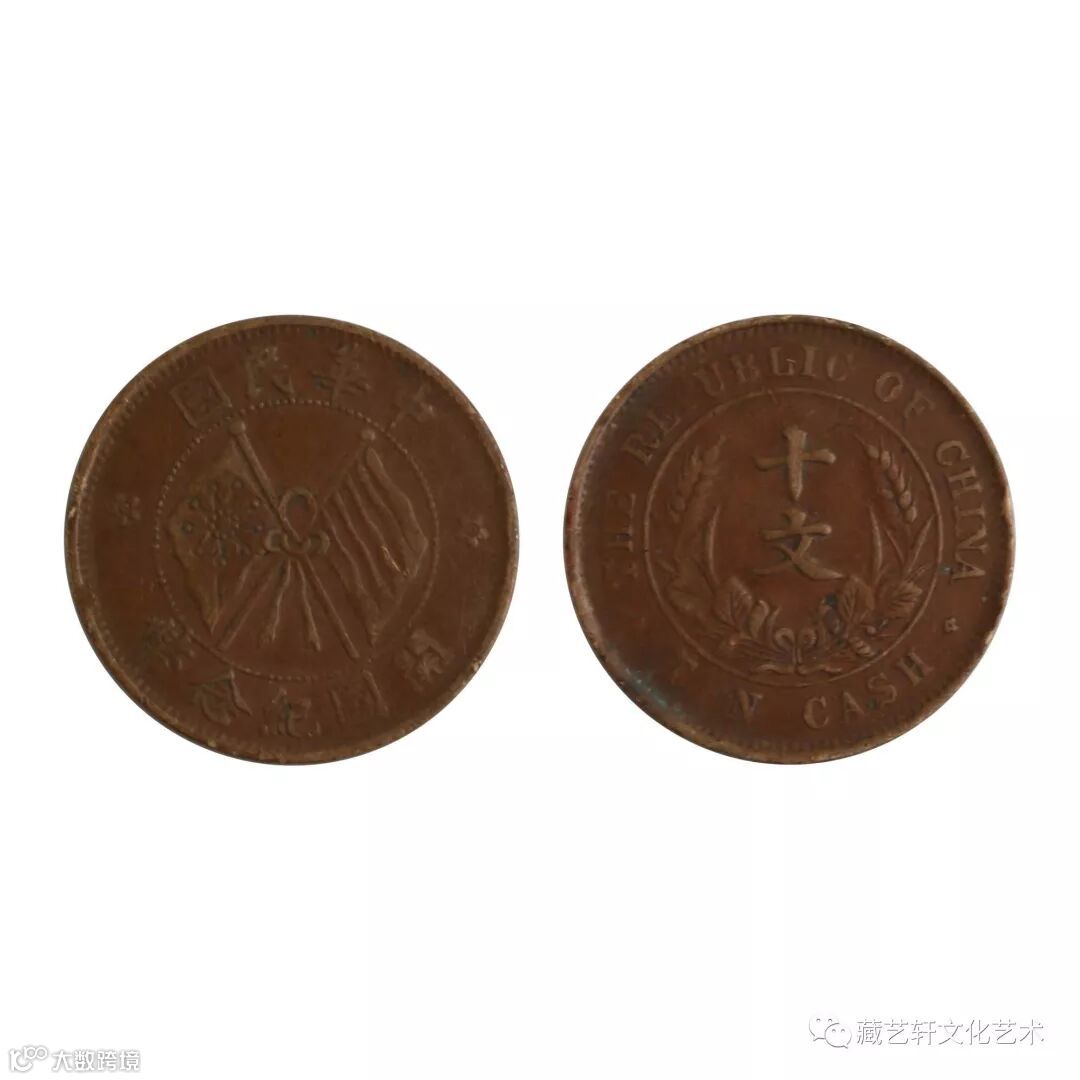此双旗币为“中华民国开国纪念币十文”,钱币正面图案中央铸有两面交叉的国旗,为国旗五色旗与九星军旗(内外各九星,一共组成十八星),上方为“中华民国”四字,下面为“开国纪念币”字样。背面图案为稻穗组成的嘉禾纹,中央竖写“十文”两字。岁月痕迹斑驳,包浆成熟,字体耄耋。此枚铜币现存世量极少,具有很高的收藏和投资价值。
