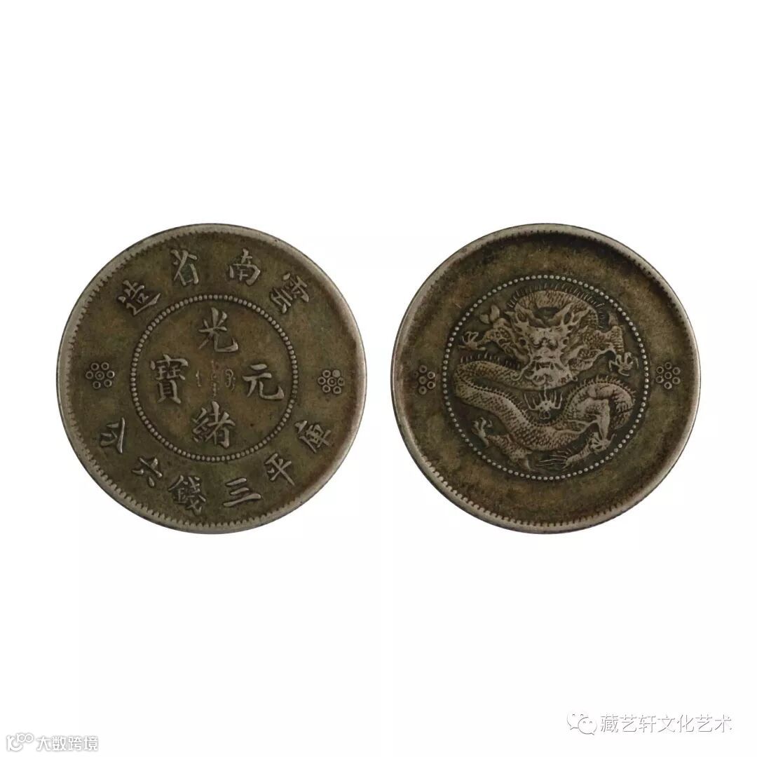 此枚“云南省造光绪元宝库平三钱六分”,钱面中心直读“光绪元宝”四字,币中心为满文“光绪元宝”顶部铸楷体“云南省造”四字,底部铸货币价值“库平三钱六分”,珠圈两侧各有一朵7个小圆圈组成的花纹装饰;钱背正中蟠龙图,左右各一7点花星。此蟠龙图是中国所有龙洋图案银元,工艺最精湛,雕工最完美,浮雕感最强烈的品种,镜面平整光滑,纹饰的相惯线,显得非常清晰。