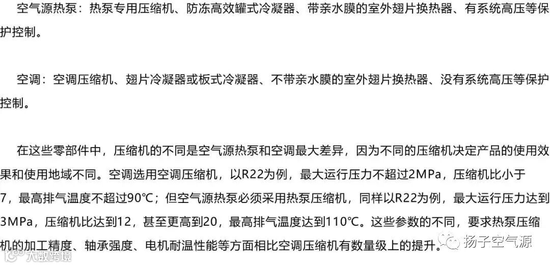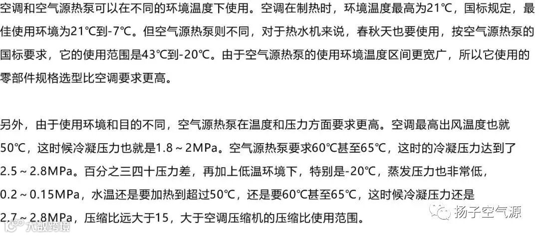 第二,空调在夏季的使用频率高,尤其在北方地区,但空气源热泵集热水、供暖、制冷为一体,冬季运行时间较长。尤其是冬季对于热水的需求量较大,所以空气源热泵需要更长时间的运行来提升水温,压缩机就需要更多的时间来运行,因此压缩机基本都是运行在冷媒较高的区域。运行温度是影响压缩机寿命的主要因素之一,在运行相同时间的条件下,空气源热泵中压缩机所受的综合负荷要高于空调中的压缩机。