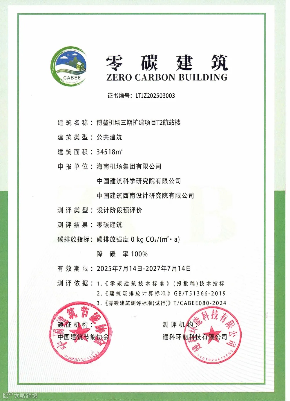 由海南控股旗下海南机场集团投资建设、海控城市综合运营集团管理的琼海博鳌国际机场三期扩建项目(以下简称“博鳌机场三期项目”)T2航站楼,近日顺利通过零碳建筑设计阶段测评,取得中国建筑节能协会颁发的“零碳建筑”标识,成为中国民航领域首个通过认证的航站楼。