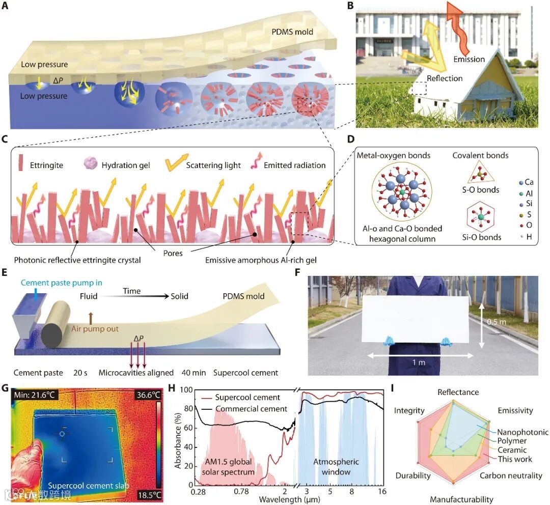 研究团队用了 “自下而上” 的方法,先挑选合适的原材料优化水泥熟料成分,再通过压力驱动的特殊工艺,用可回收的模具做出带有微小凹腔的水泥表面(也就是 “超表面”)。这种工艺能让水泥里的钙矾石晶体在微腔表面整齐排列,再加上水泥内部的细小孔隙,让它既能反射 96.2% 的太阳光,又能高效散发自身热量。