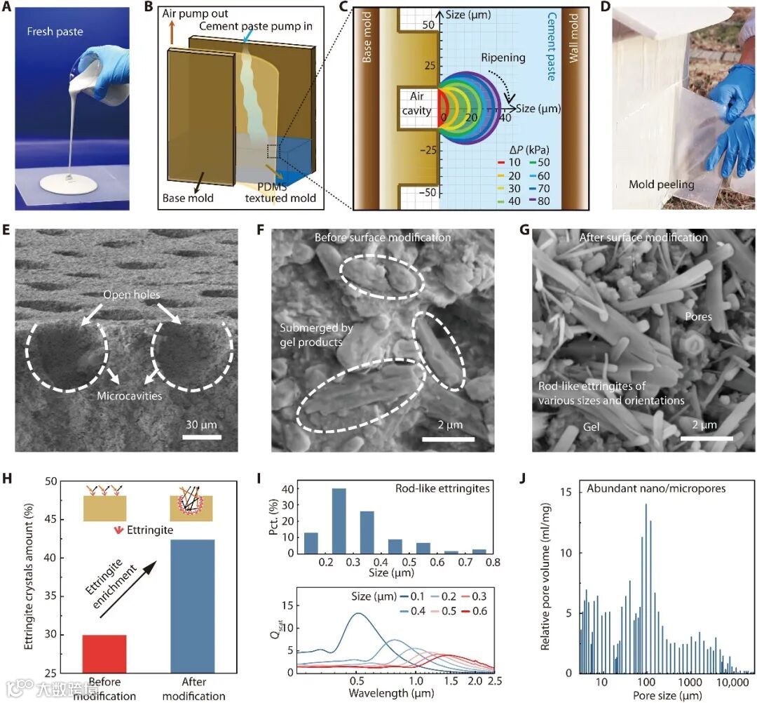 图2系统性地阐释了超冷水泥超表面的制备过程、关键形貌特征及其光学增强机制。该图详细展示了从具有良好流动性的新鲜水泥浆体(图2A)开始,经由双模具反转和气压差驱动的空穴策略(图2B, C),最终形成具有规则排列凹形微腔结构(图2E)的完整工艺流程。通过扫描电镜(SEM)图像和定量分析,该图清晰地对比了表面改性前后微观结构的根本差异:未经改性时,高反射率的钙矾石晶体被无定形凝胶包裹埋没(图2F);而经过超表面工程处理后,棒状钙矾石晶体得以在微腔表面定向富集与组装(图2G, H)。