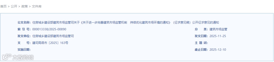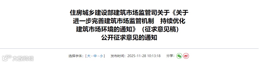 为贯彻落实《中共中央 国务院关于加快建设全国统一大市场的意见》精神,进一步夯实建筑市场经营主体责任,强化建筑市场监管,优化建筑市场环境,加快构建“宽进、严管、重处”建筑市场监管机制,我们研究起草了《关于进一步完善建筑市场监管机制 持续优化建筑市场环境的通知》(征求意见稿),现向社会公开征求意见。有关单位和个人可于2025年12月10日前,通过以下途径和方式提出反馈意见。