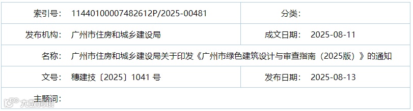 为更好推动绿色建筑发展,指导我市绿色建筑设计与审查,依据《绿色建筑评价标准》GB/T 50378-2019(2024年版),我局组织编制了《广州市绿色建筑设计与审查指南(2025版)》,现印发给你们,供参考使用。各单位在使用过程中如有相关问题和建议,请径向我局反馈。