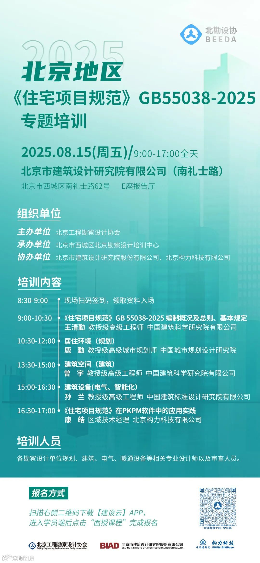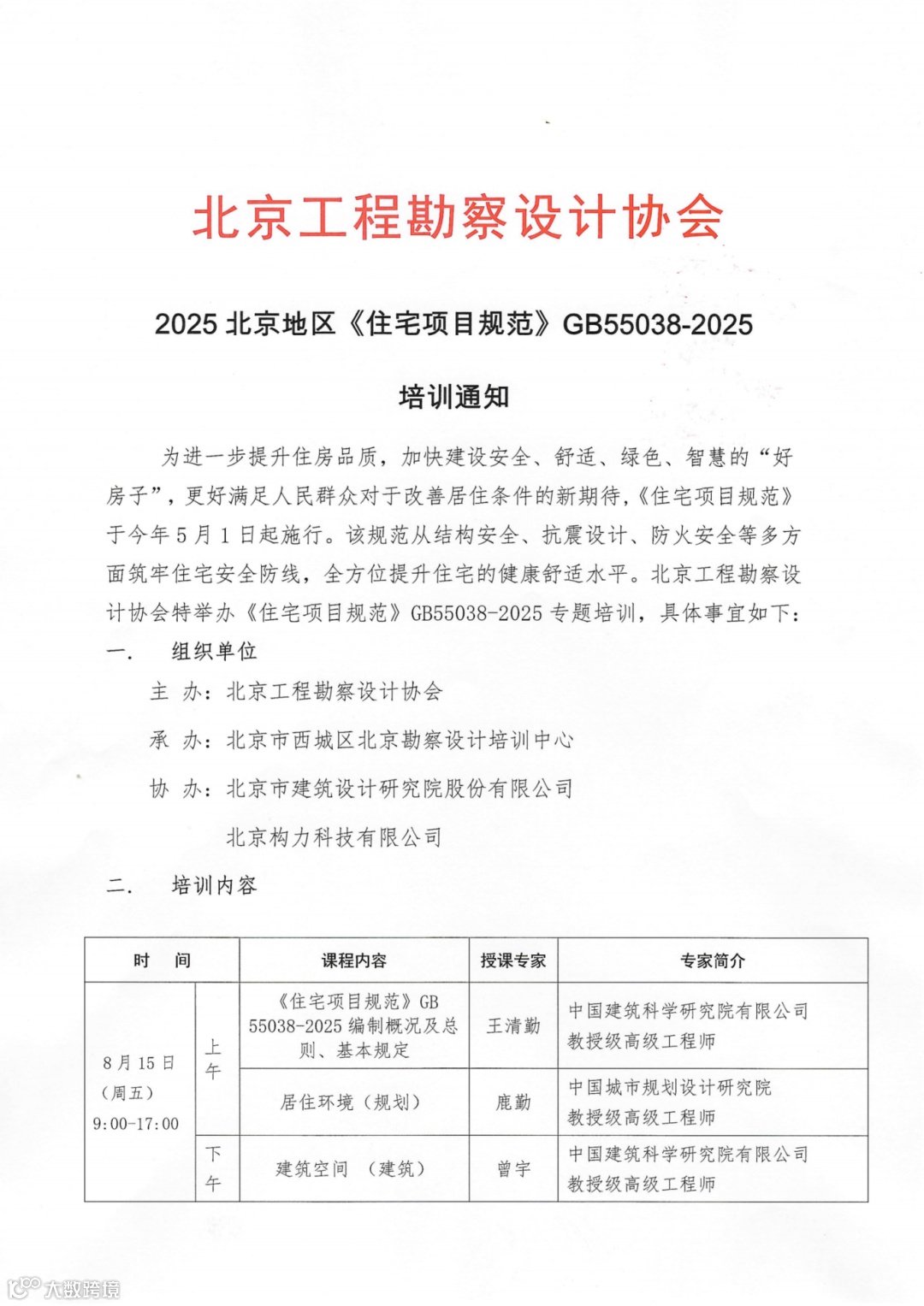 为进一步提升住房品质,加快建设安全、舒适、绿色、智慧的“好房子”,更好满足人民群众对于改善居住条件的新期待,《住宅项目规范》于今年5月1日起施行。该规范从结构安全、抗震设计、防火安全等多方面筑牢住宅安全防线,全方位提升住宅的健康舒适水平。北京工程勘察设计协会特举办《住宅项目规范》GB55038-2025专题培训(免费),具体事宜如下: