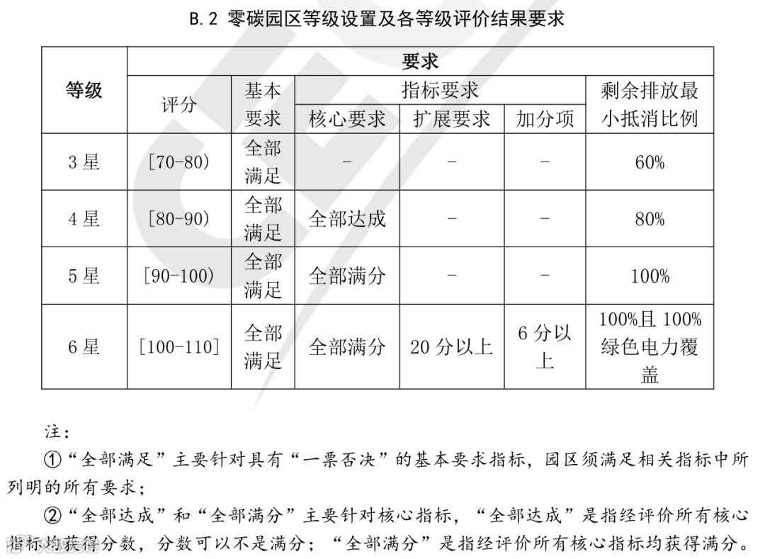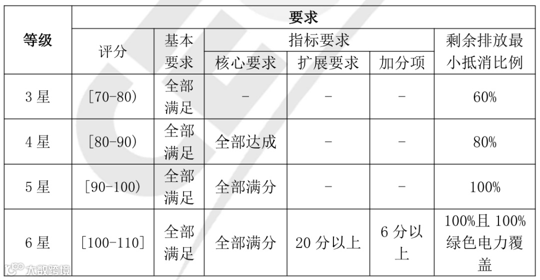 总共110分,需要得到70分以上,碳排放最小抵消比例60%,根据得分高低和抵消比例分为3星到6星四个等级。