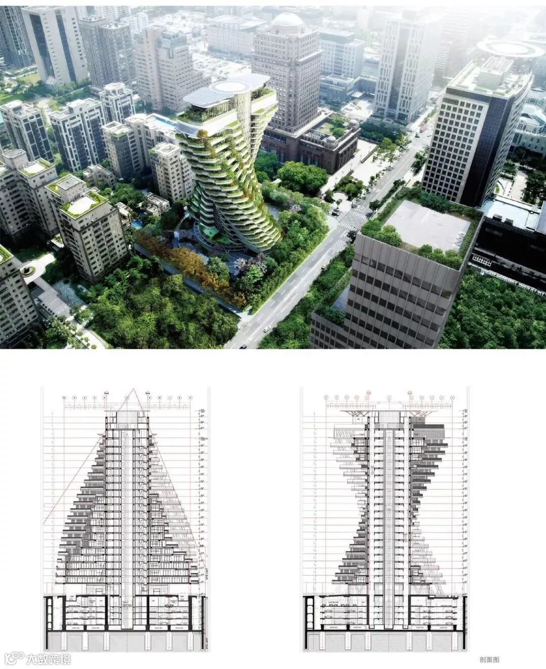 这种扭转是对4个主要目标的回应:① 整合了建筑体的南、北锥体区域并尊重城市特性。② 将露天空中花园的面积最大化(不计入容积率)。这样一来,露台的种植面积将远远超过要求的10%。③ 为所有居民提供独特的台北天际线全景,尤其是朝向台北101塔和中心商业区的观景条件。④ 利用渐进式的几何形体形成多变的标准层,通过繁茂的绿植和视觉遮挡来保证每个公寓单元的隐私。