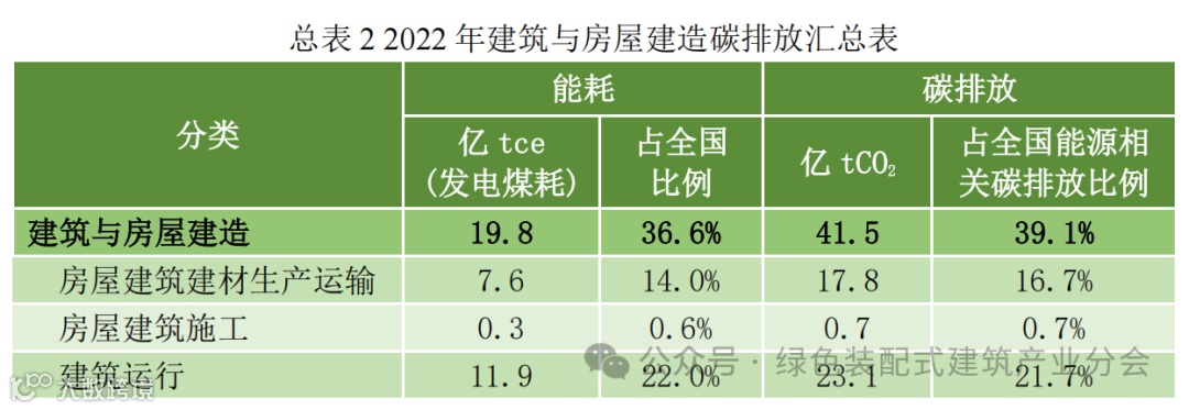 房屋建筑方面,2022年,建筑与房屋建造能耗总量为19.8亿tce(详见总表 2),占全国能源消费总量的36.6%,其中:房屋建筑建材生产运输能耗7.6亿tce,施工能耗0.3亿tce,运行能耗11.9亿tce。建筑与房屋建造碳排放总量为41.5亿tCO₂(详见总表2),占全国能源相关碳排放39.2%,其中:房屋建筑建材生产运输碳排放17.8亿tCO₂,施工碳排放0.7亿tCO₂,运行碳排放23.1亿tCO₂。