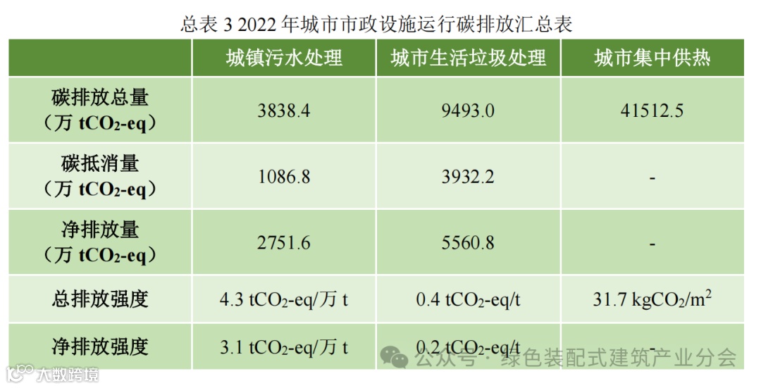 城市市政设施运行方面,2022年,全国城镇污水处理全过程碳排放总量为3838.4万tCO₂-eq,碳抵消量为1086.8万tCO₂-eq,净排放量为2751.6万tCO₂-eq;城市生活垃圾处理全过程碳排放总量为9493.0万tCO₂-eq,碳抵消量为3932.2万tCO₂-eq,净排放量为5560.8万tCO₂-eq。2022年,城市集中供热碳排放总量为41512.5万tCO₂(即建筑运行碳排放中的热力排放),平均碳排放强度31.7kgCO₂/㎡,碳排放因子84.0kgCO₂/GJ(详见总表3)。