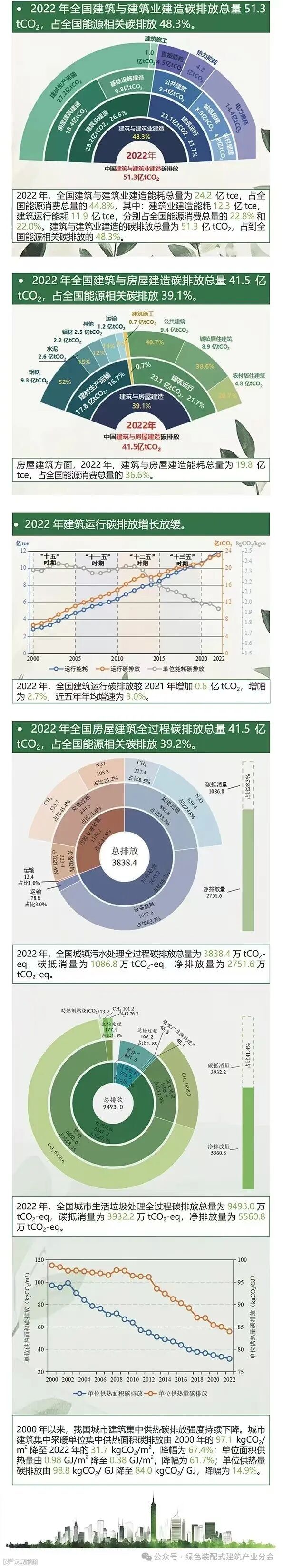 《中国城乡建设领域碳排放研究报告(2024年版)》基于最新的国家宏观统计数据,对2022年我国建筑与建造、城市市政设施运行的能耗与碳排放进行了深入测算与分析。报告指出,2022年全国建筑与建筑业建造碳排放总量达51.3亿吨二氧化碳,占全国能源相关碳排放的48.3%。其中,建筑业建造碳排放28.2亿吨二氧化碳,建筑运行碳排放23.1亿吨二氧化碳。建筑与房屋建造碳排放总量为41.5亿吨二氧化碳,占全国能源相关碳排放的39.2%。此外,报告还对城镇污水处理、城市生活垃圾处理和城市集中供热等城市市政设施运行的碳排放数据进行了更新,为全面了解城乡建设领域的碳排放情况提供了详实依据。文末可下载全文。