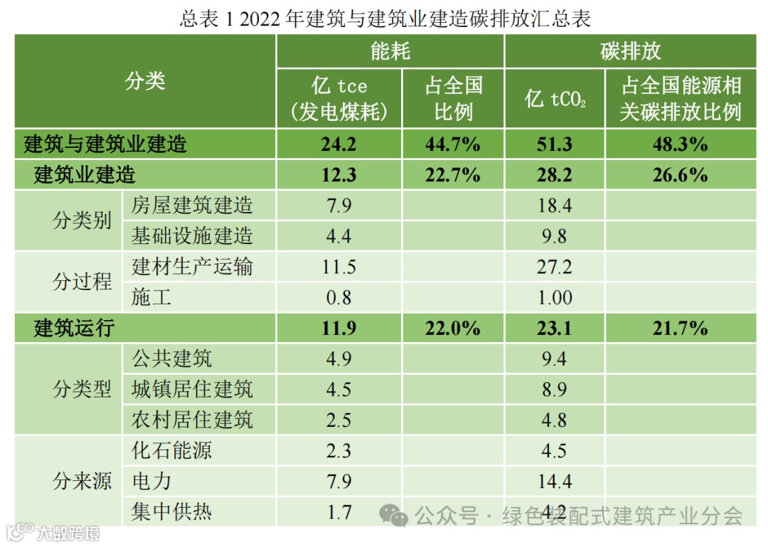 建筑与建筑业建造方面,主要包括建筑运行与建筑业建筑建造,建筑业建造包括建材生产运输和施工安装。2022年,全国建筑与建筑业建造能耗总量为24.2亿tce(详见总表1),占全国能源消费总量的44.8%,其中:建筑业建造能耗12.3亿tce,建筑运行能耗11.9亿tce,分别占全国能源消费总量的22.8%和22.0%。建筑与建筑业建造的碳排放总量为51.3亿tCO₂(详见总表 1),占到全国能源相关碳排放的48.3%,其中:建筑业建造碳排放28.2亿tCO₂,建筑运行碳排放23.1亿tCO₂,分别占全国能源相关碳排放的26.6%和 21.7%。建筑业建造碳排放中,按类别分,分别为房屋建筑建造18.4亿tCO₂,基础设施建造9.8亿tCO₂;按过程分,分别为建材生产运输27.2亿tCO₂,建筑施工1.0亿tCO₂。建筑运行碳排放中,按建筑类型分,分别为公共建筑9.4亿tCO₂,城镇居住建筑8.9亿tCO₂,农村居住建筑4.8亿tCO₂;按排放来源分,分别为化石能源直接排放4.5亿tCO₂,电力排放14.4亿tCO₂,热力排放4.2亿tCO₂。