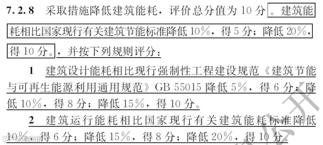 2 建筑运行阶段能耗相比国家现行有关建筑能耗标准降低10%,得6分;降低15%,得8分;降低20%,得10分。