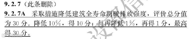 在第9章提高与创新,9.2.7 调整为“采取措施降低建筑全寿命期碳排放强度,评价总分值为30分。降低10%,得10分;每再降低1%,再得1分,最高得 30 分。”
