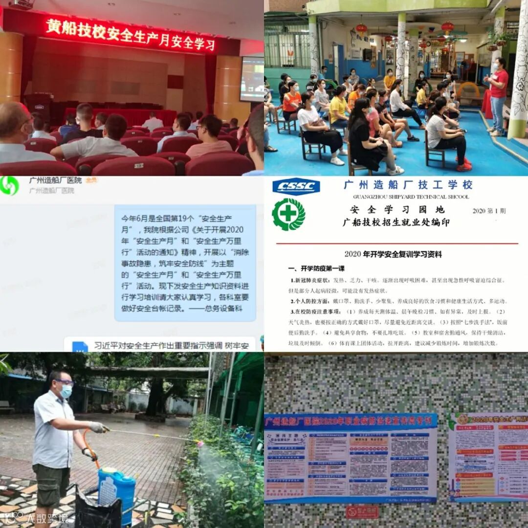 广船医院、广船技校、黄船技校、广船幼儿园和广船养老院充分利用校宣传栏、校班前会、钉钉及校安全学习园地等平台积极宣传教育,将安全知识带到日常生活中、工作中,进一步加强全员安全意识,保障良好的安全环境。